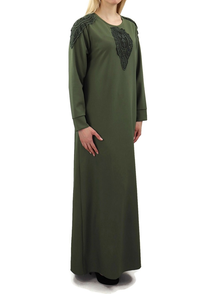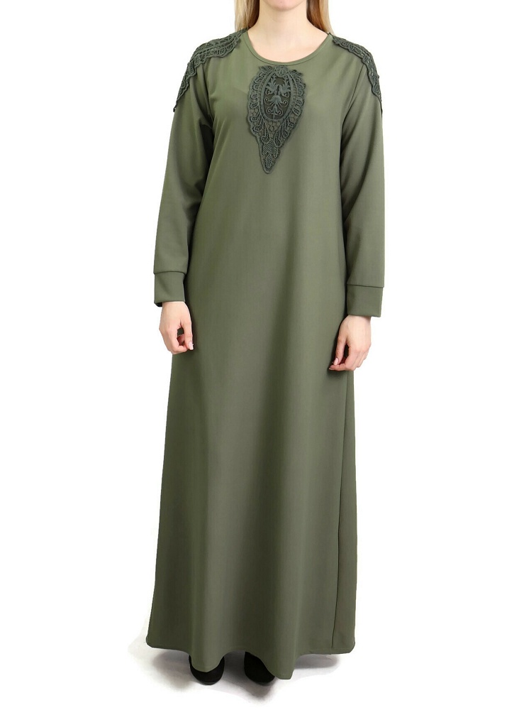 Robe très longue évasée de avec poches et broderies sur l'avant et les épaules. Tissu fluide, élastique et épais (non transparent).