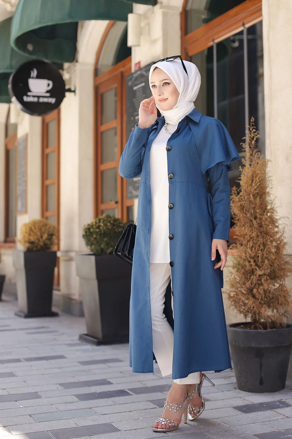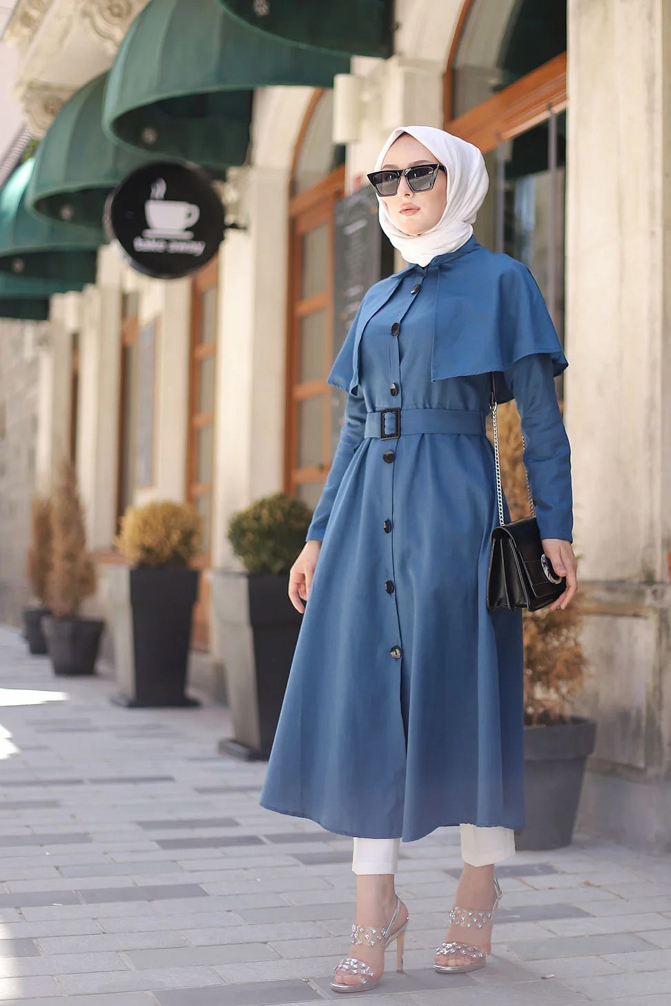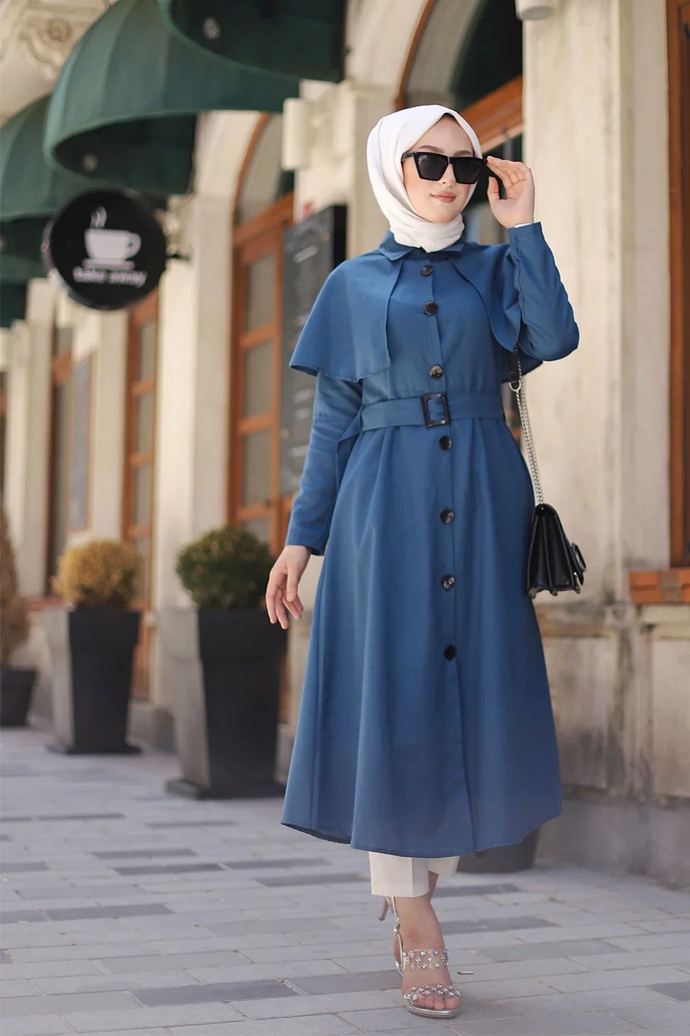 Robe mi longue style Trench (Vêtement hijab) pour femme voilée) - Couleur bleu pétrole Vetement & Accessoire
