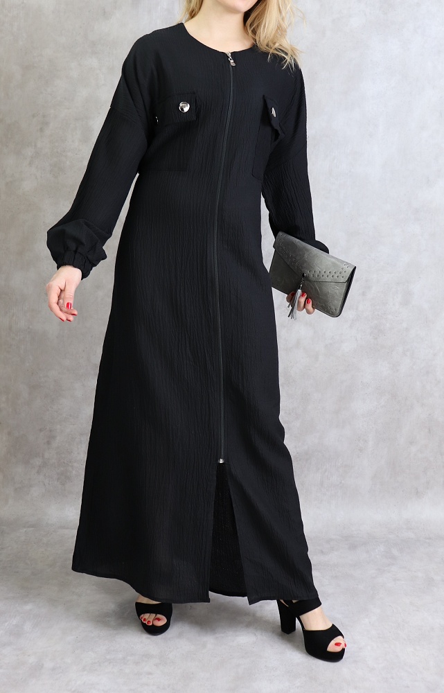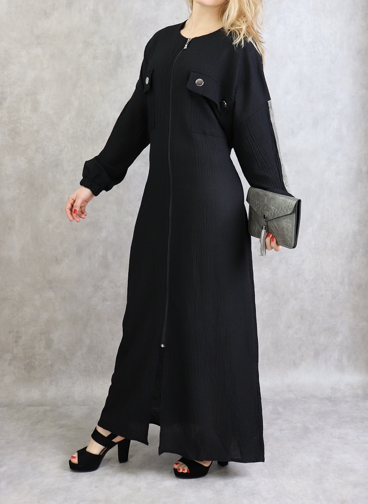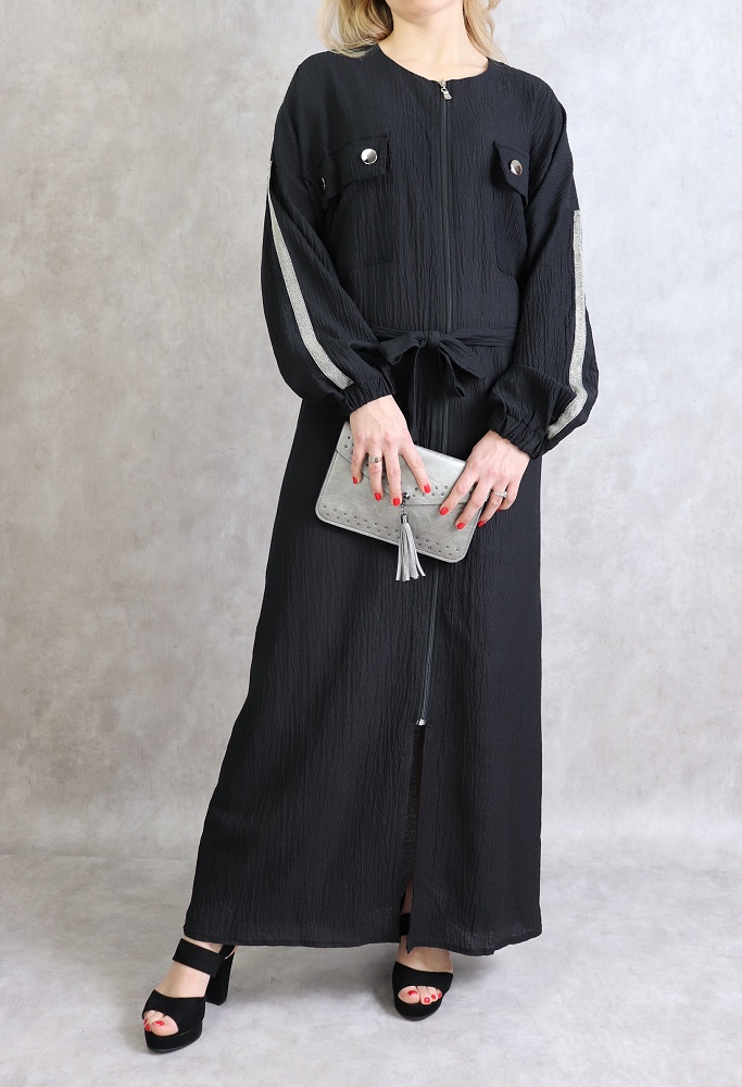 Abaya noire "Dubai" tissu satiné avec strass - REF. 21579 (45.00 €)