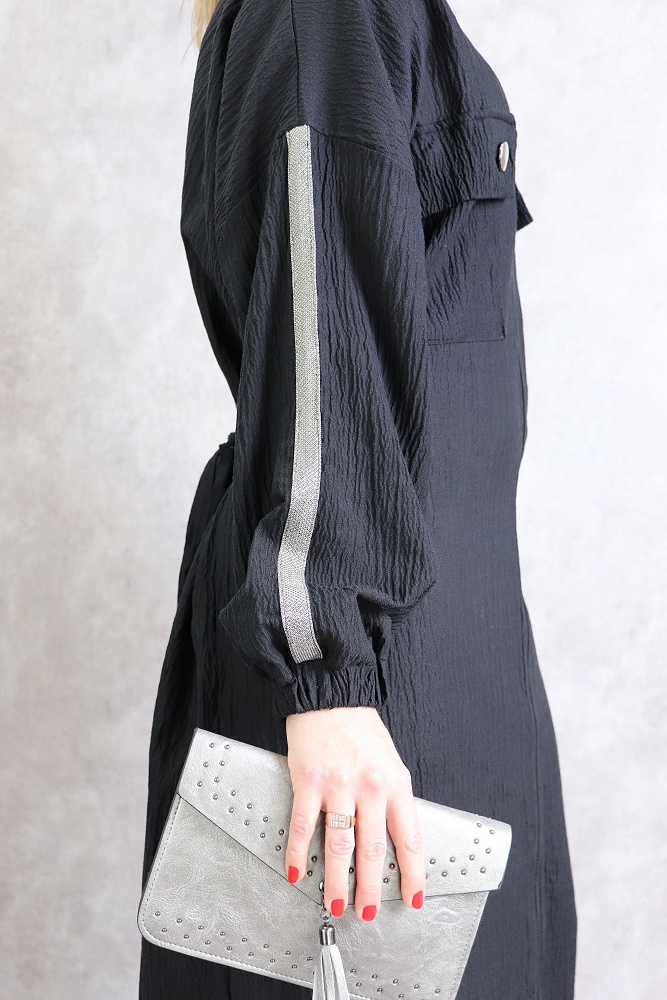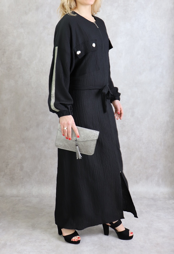 Robe noire maxi-longue à zip et bandes argentées - Robe moderne et casual pour femme Vetement & Accessoire