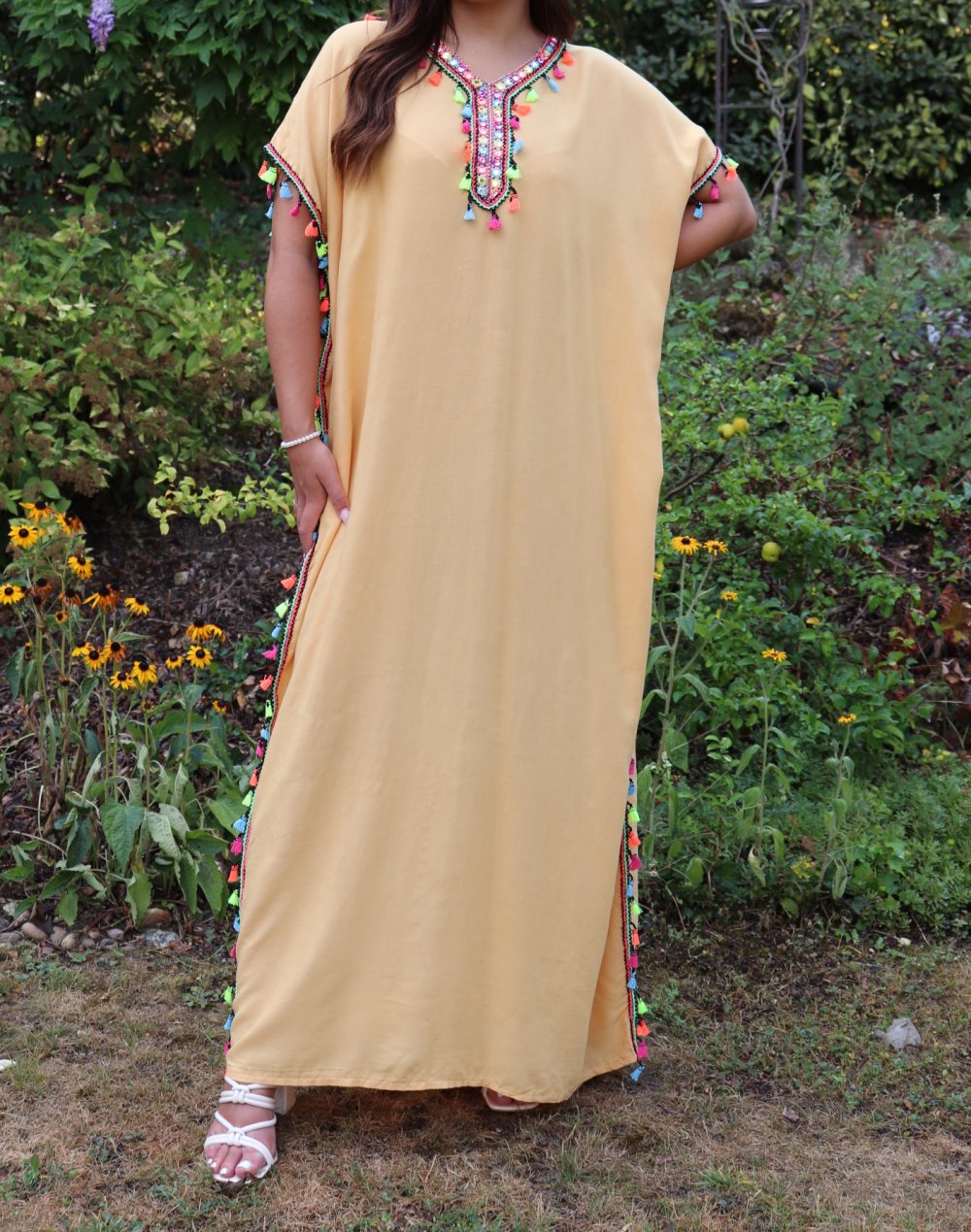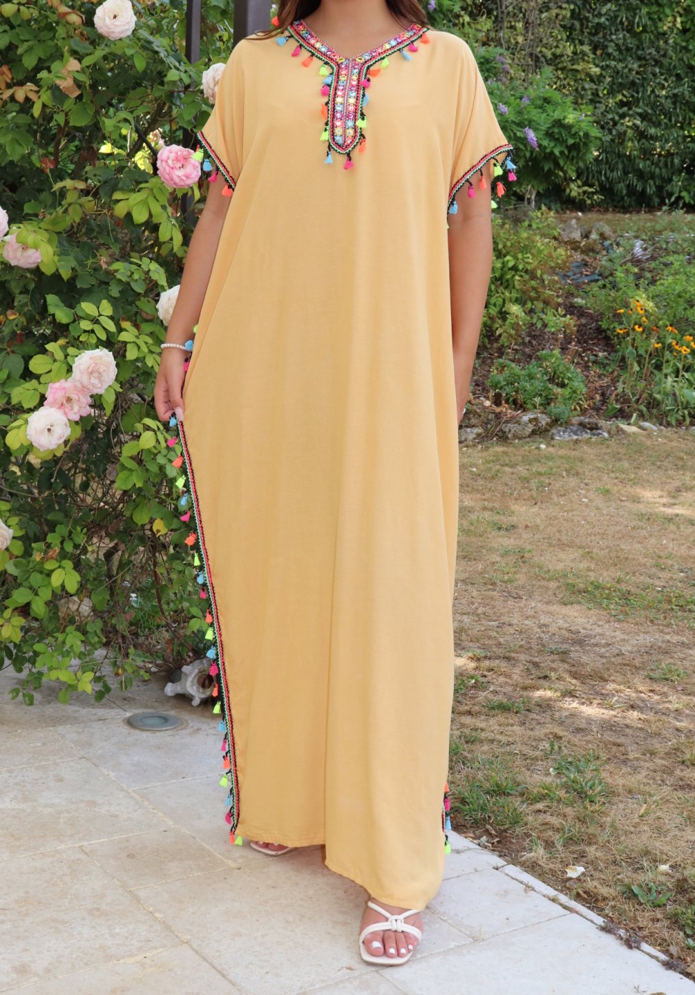Robe orientale avec pompons multicolores (Robes pas cheres pour femme) - Couleur jaune paille