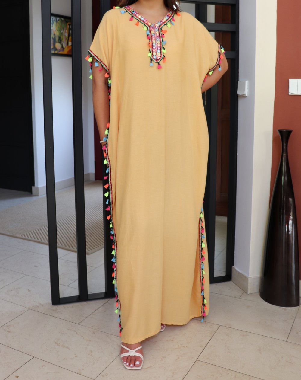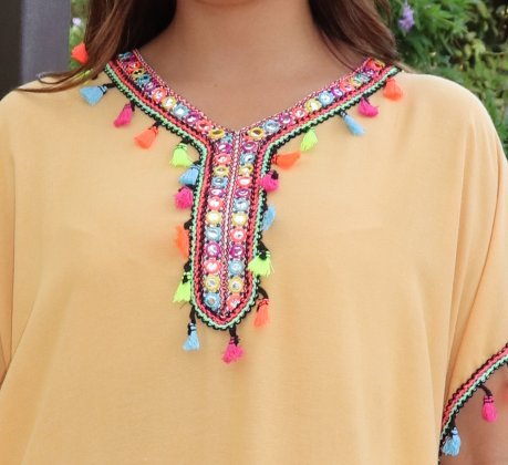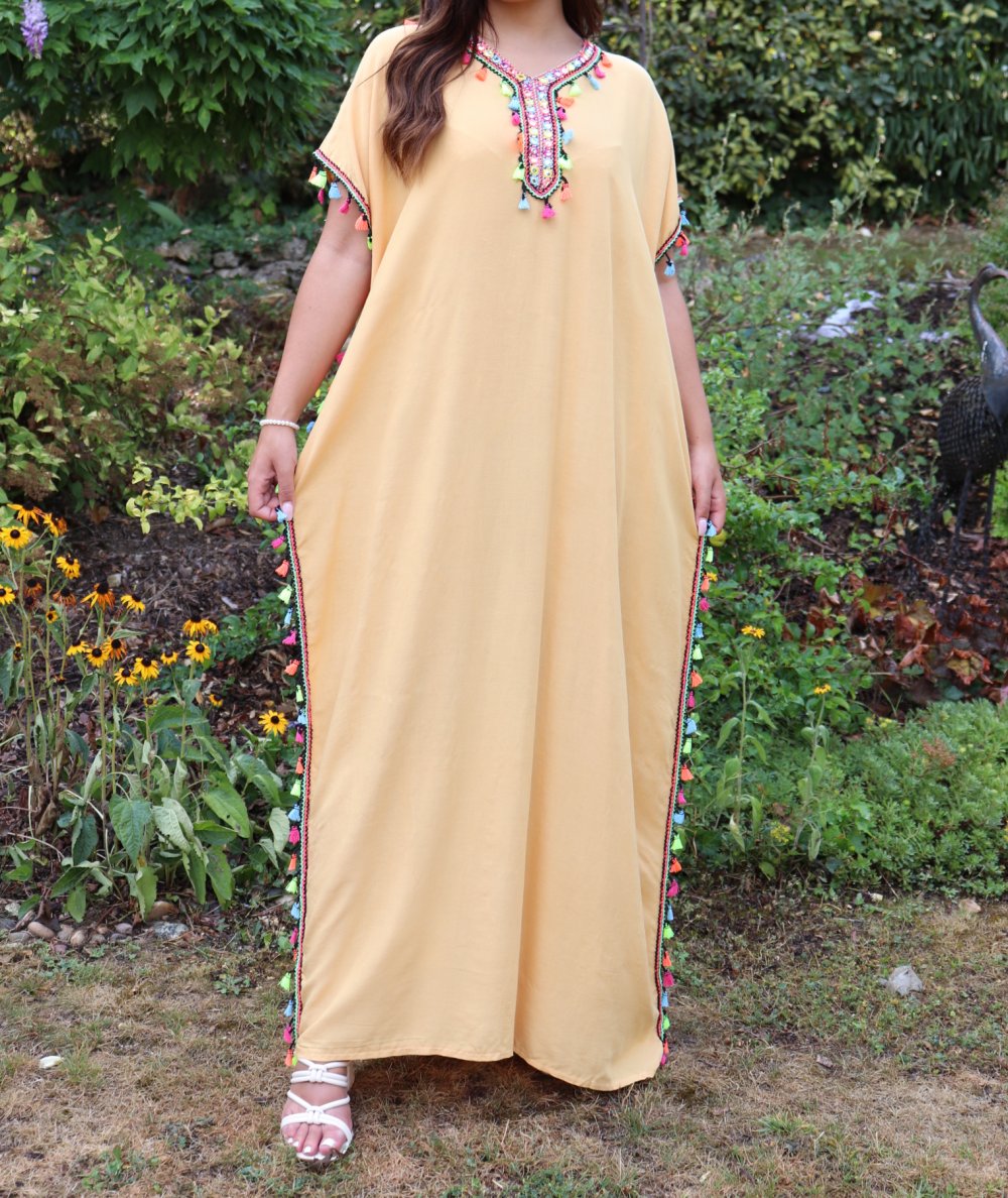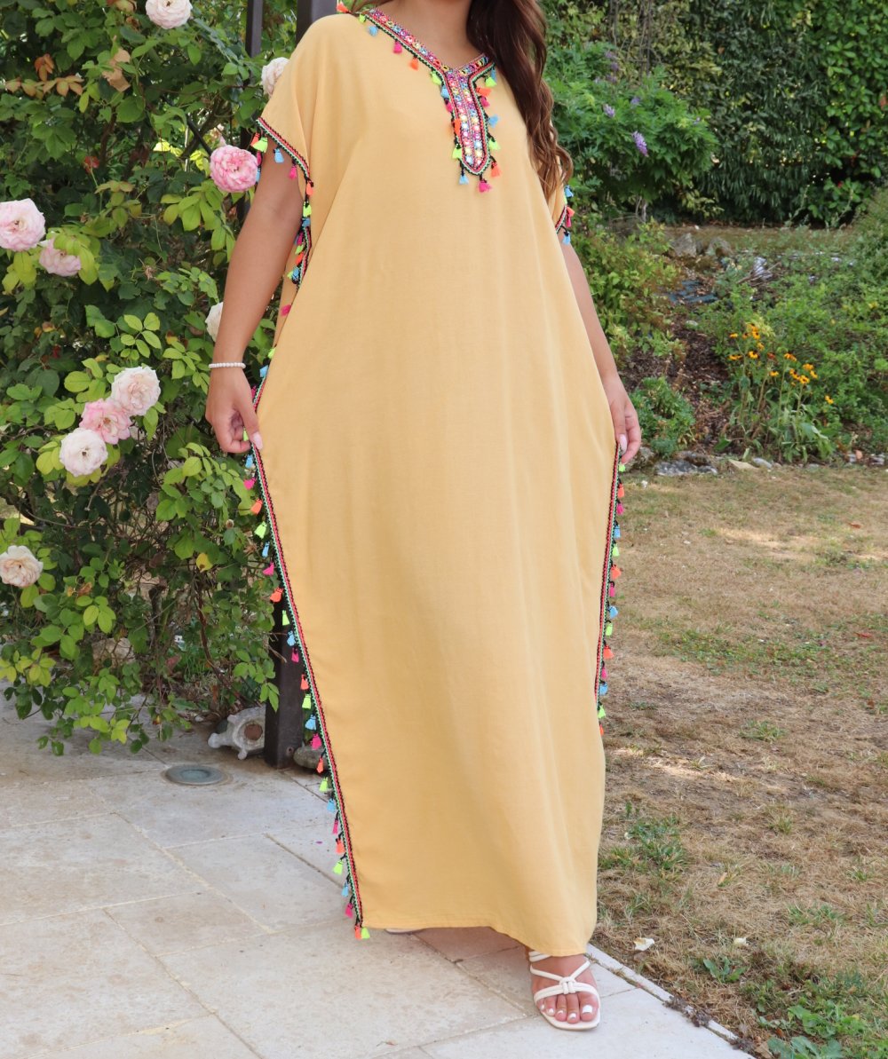 Robe orientale avec pompons multicolores (Robes pas chères pour femme) - Couleur jaune paille Vetement & Accessoire