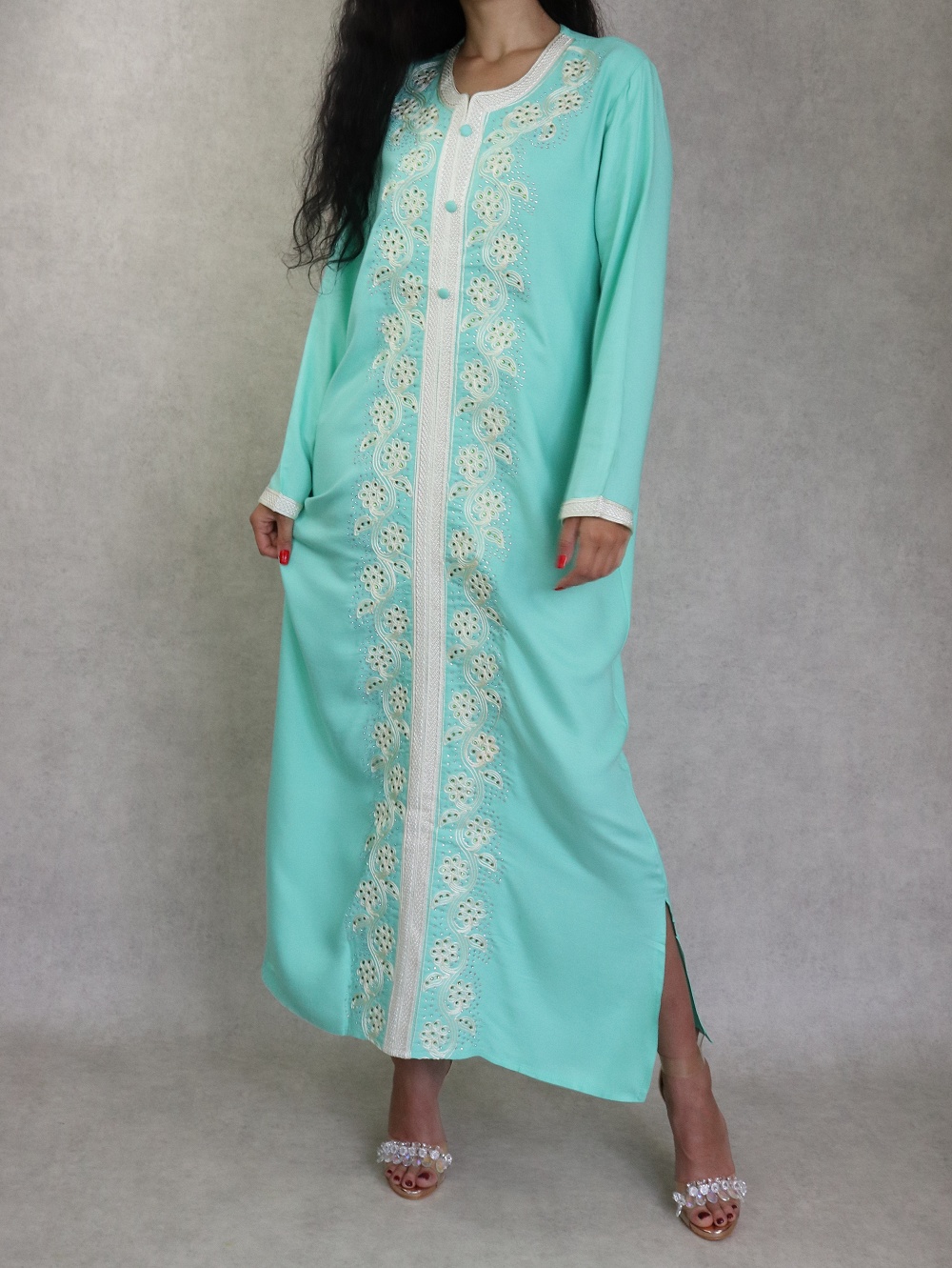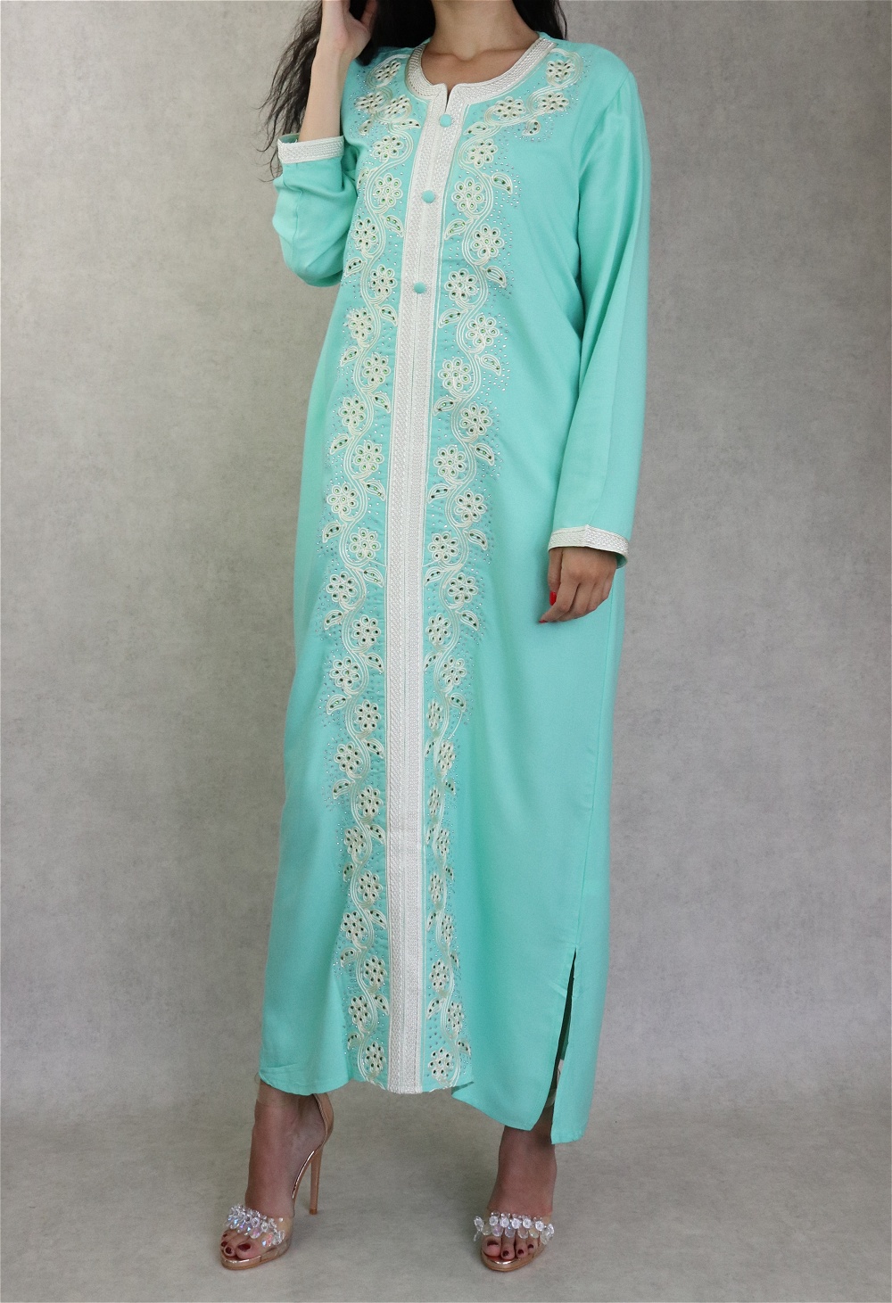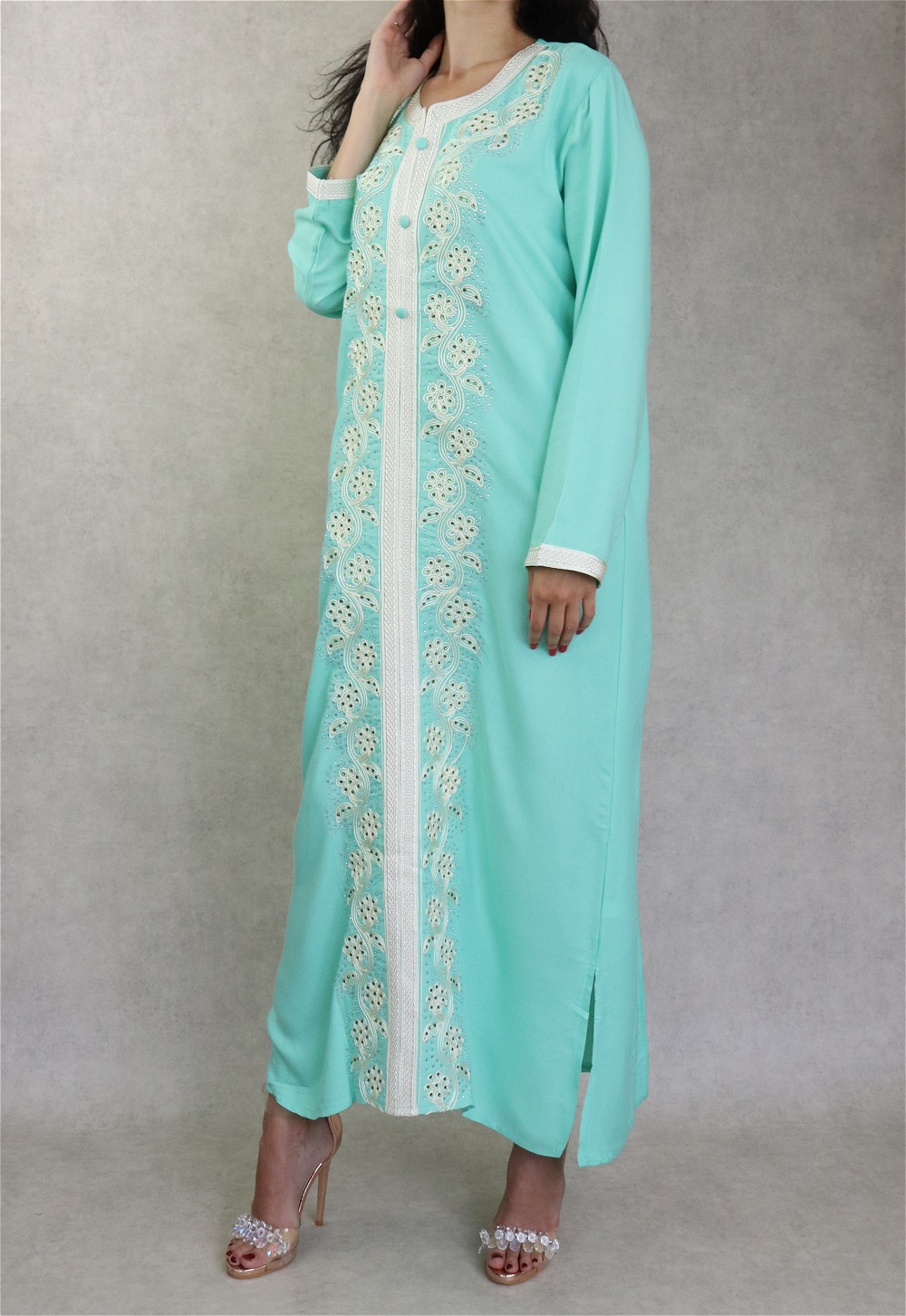 Robe orientale brodée manches longues pour femme - Couleur Vert pastel Vetement & Accessoire