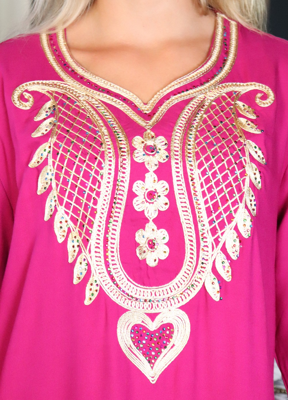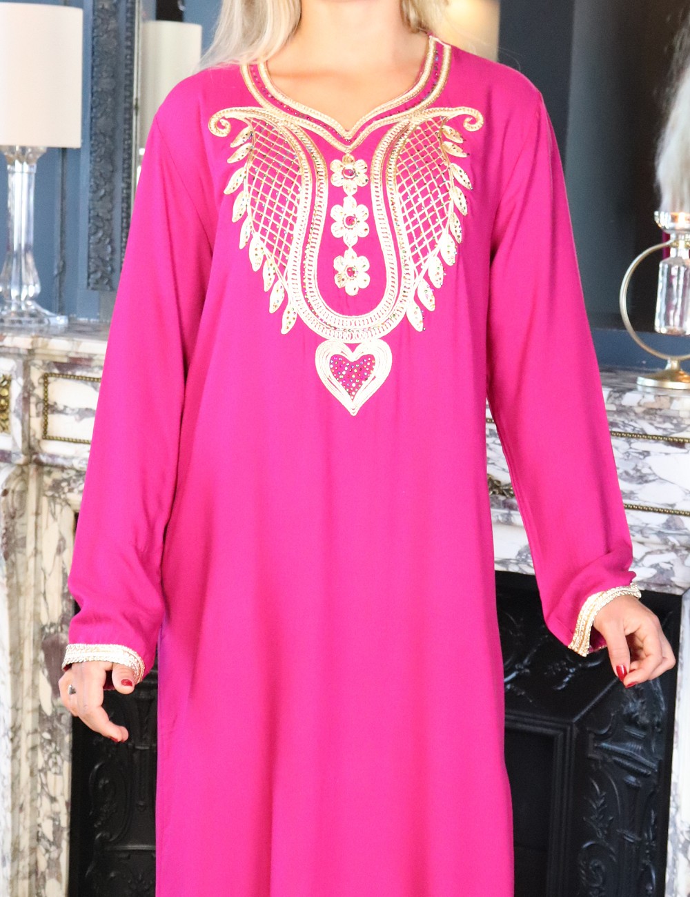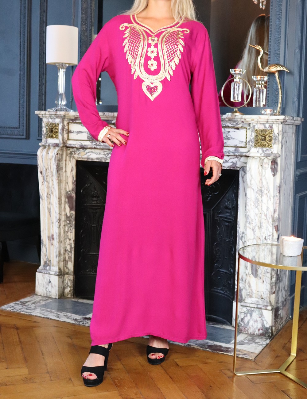 Robe orientale de maison pour femme avec broderie et strass - Couleur Rose Fuchsia