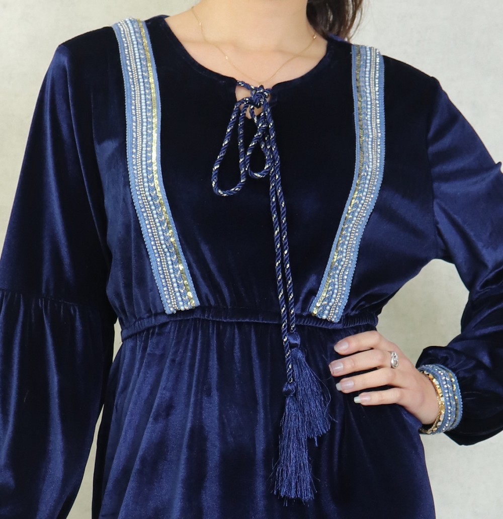 Robe orientale en velours avec broderies perles et strasses pour femme - Couleur Bleu marine