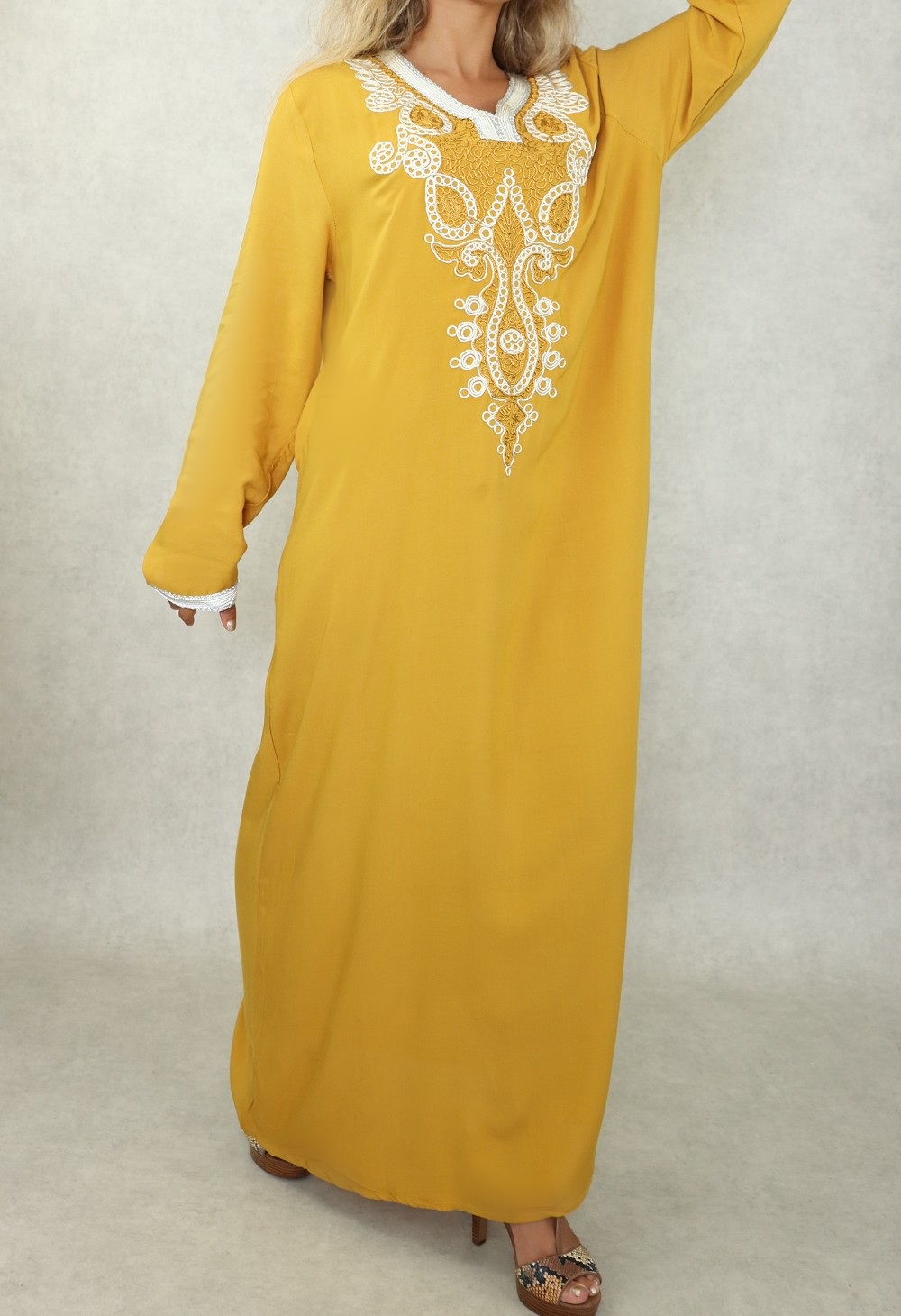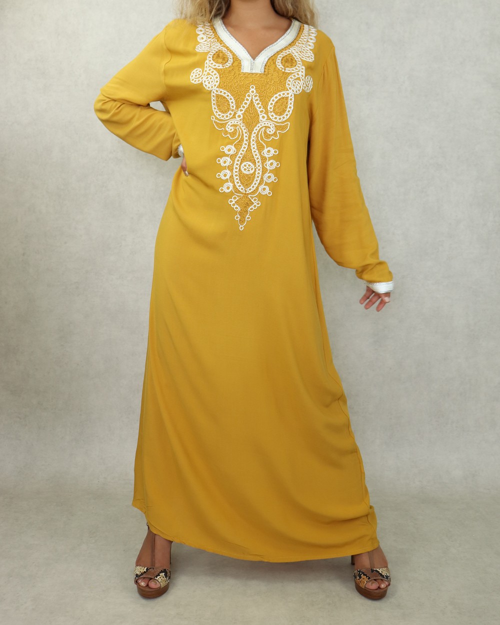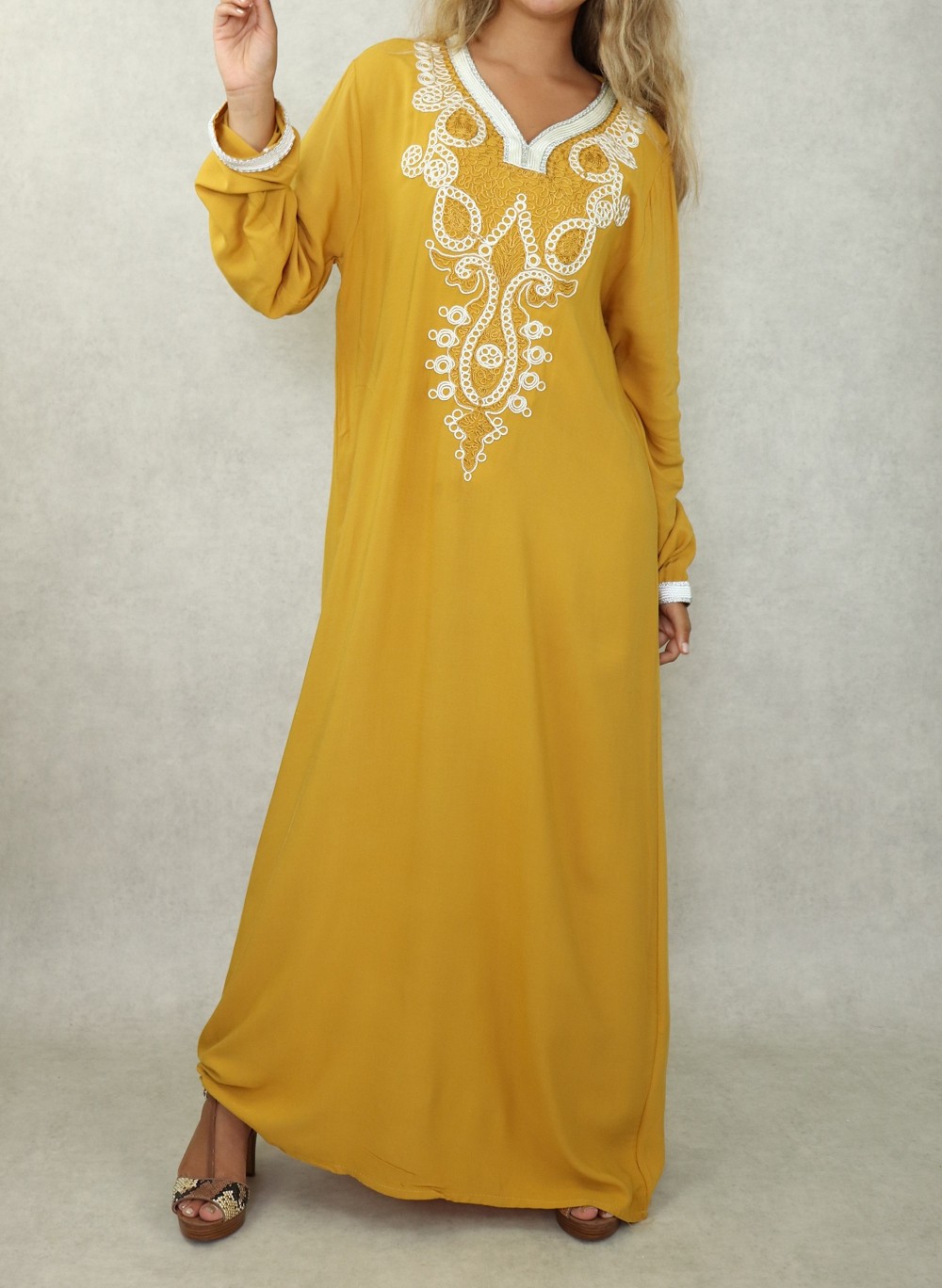 Robe orientale longue avec belles broderies en coton pour femme - Couleur moutarde Vetement & Accessoire