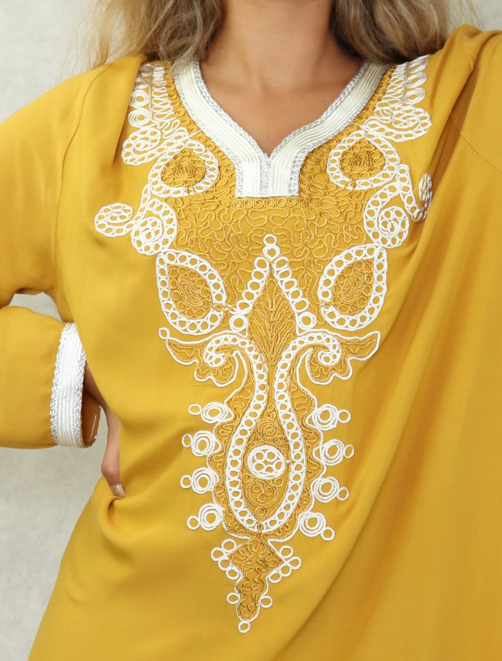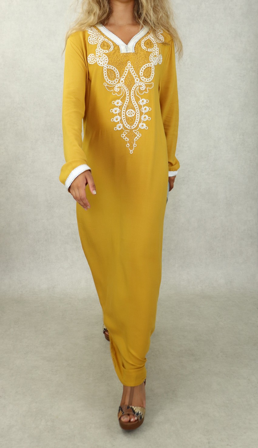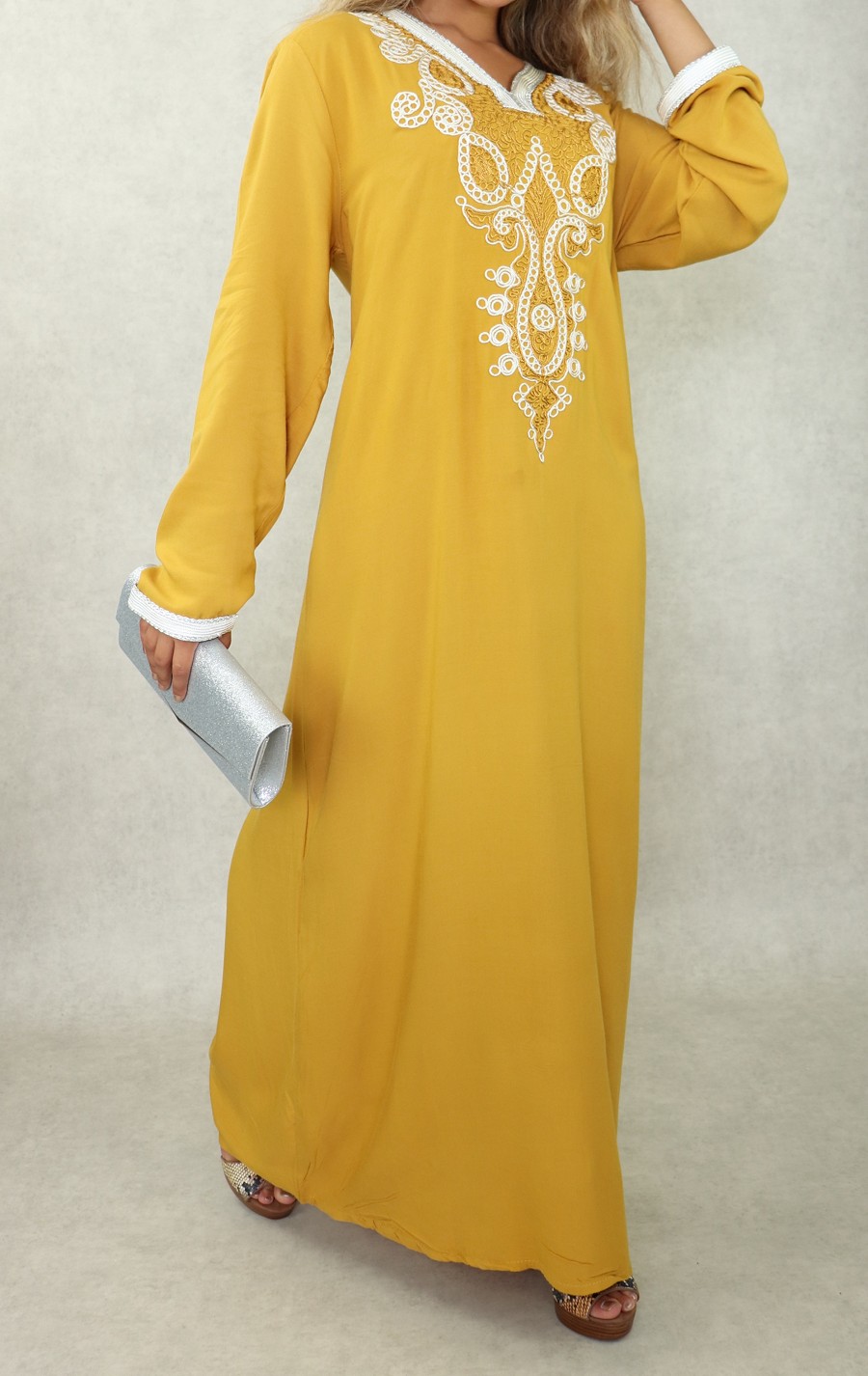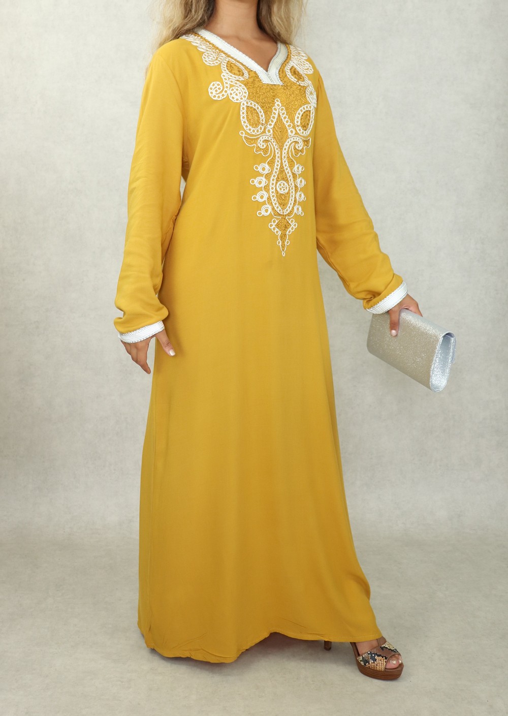 Robe orientale longue avec belles broderies en coton pour femme - Couleur moutarde Vetement & Accessoire