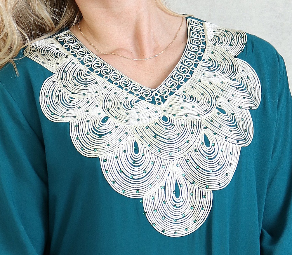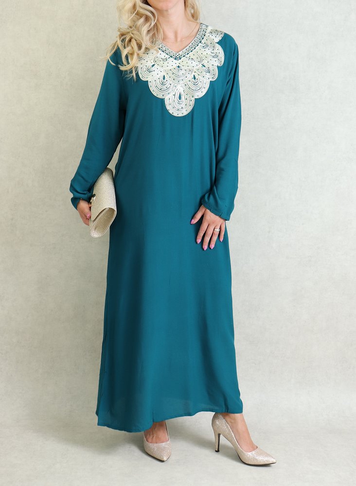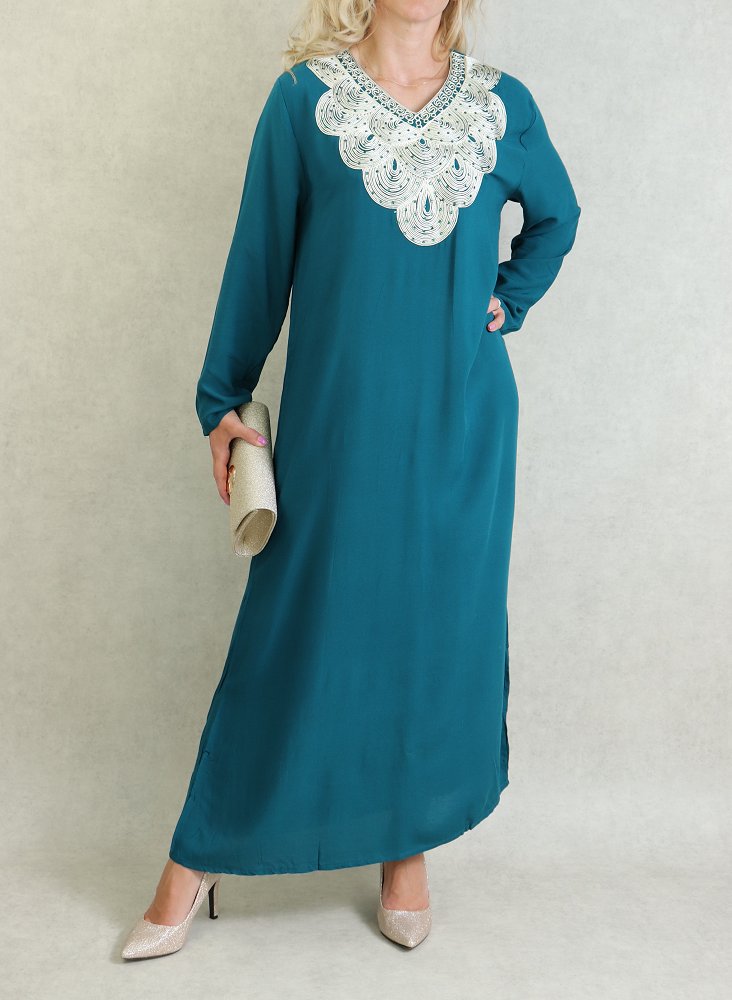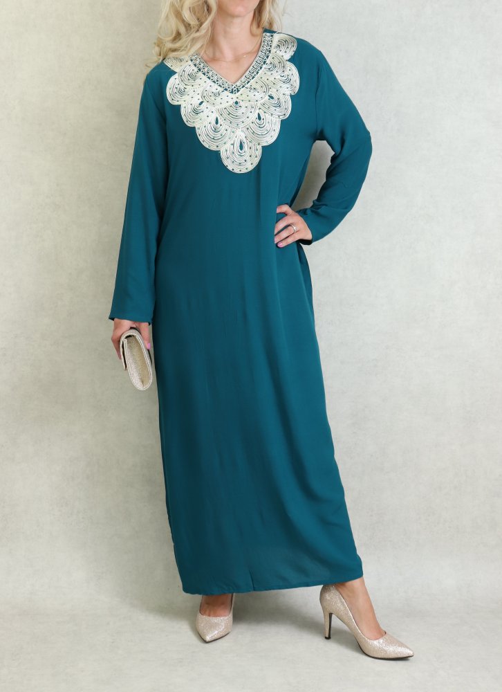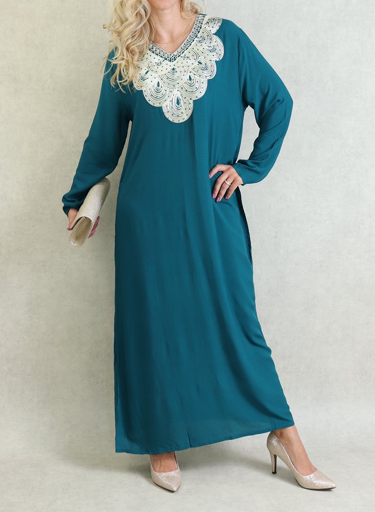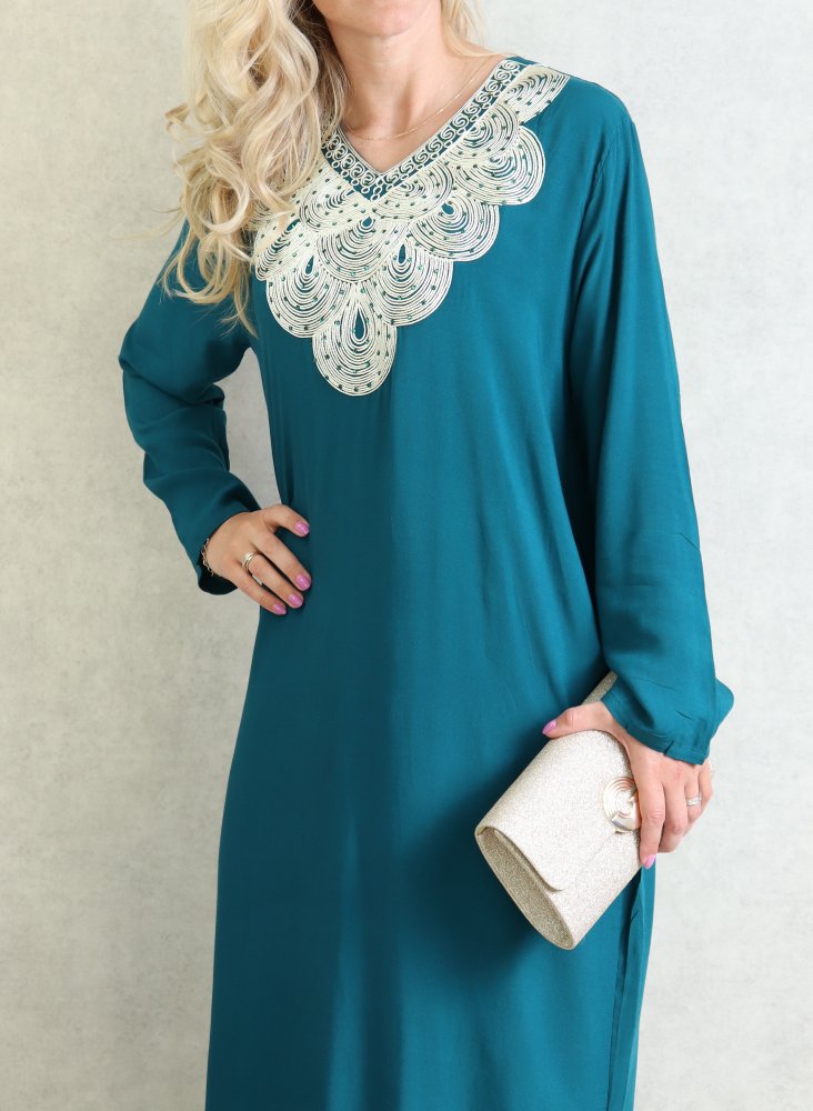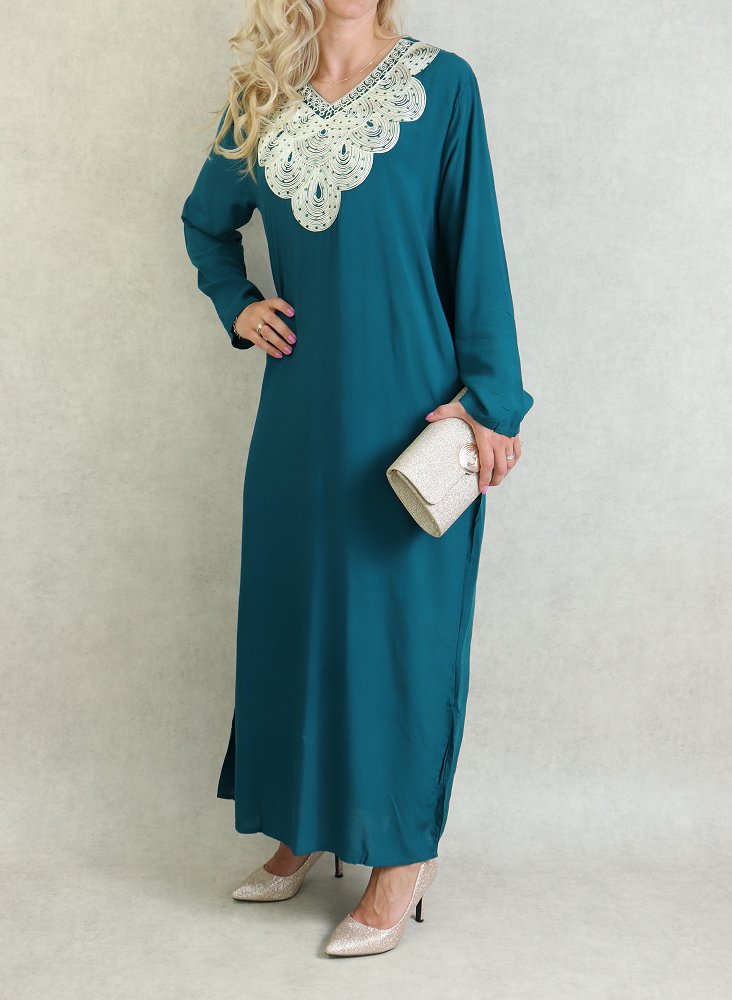 Robe orientale longue avec broderies - Manches longues - Couleur Vert Canard Vetement & Accessoire