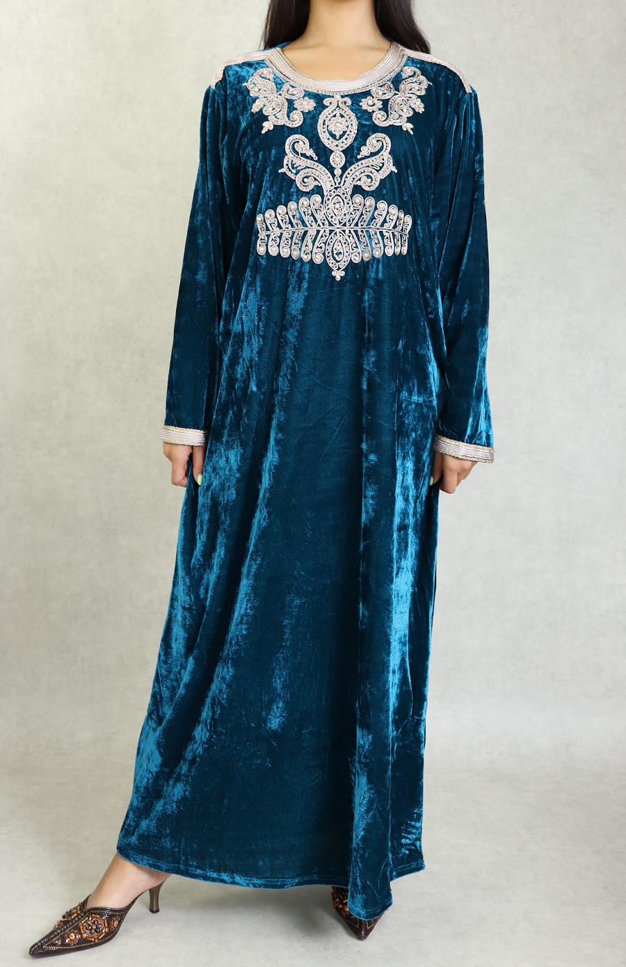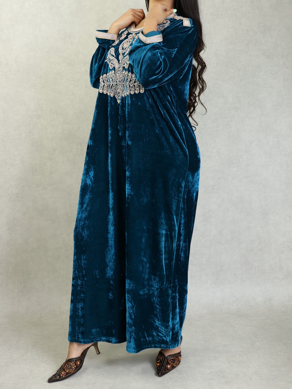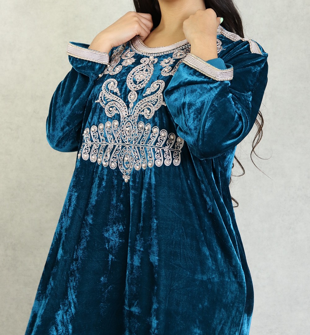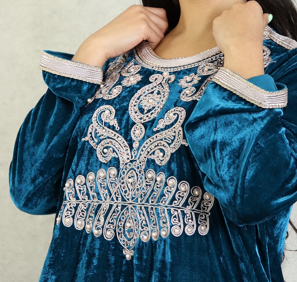 Robe orientale manches longues effet velours style tunisien avec broderie et perle pour femme - Couleur Bleu canard Vetement & Accessoire
