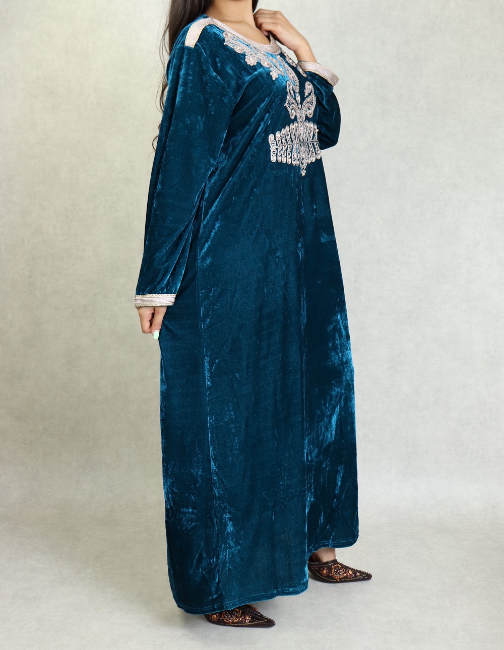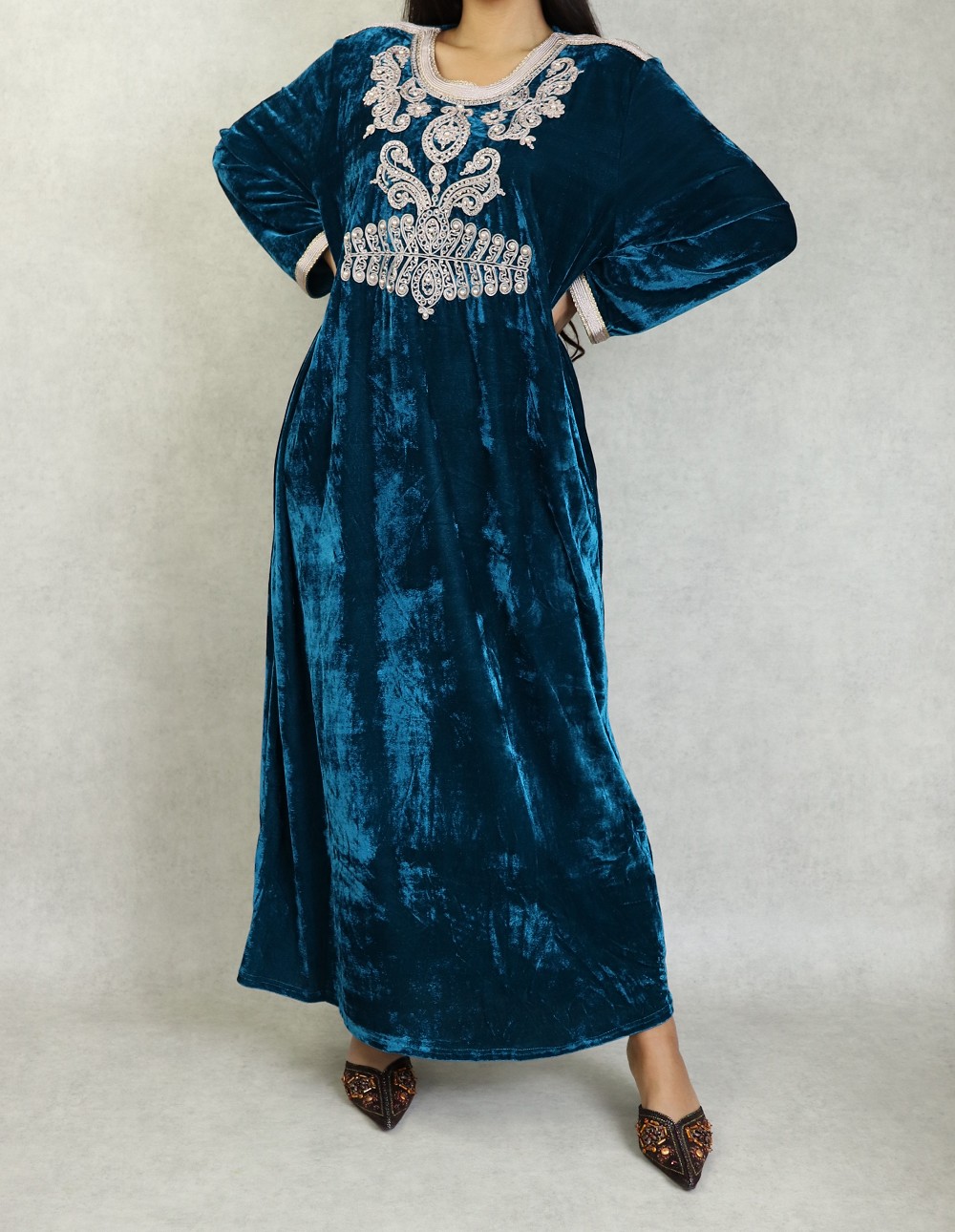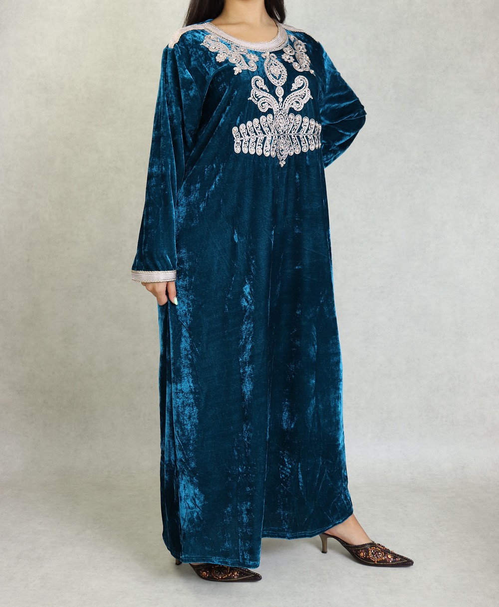 Robe orientale manches longues effet velours style tunisien avec broderie et perle pour femme - Couleur Bleu canard Vetement & Accessoire