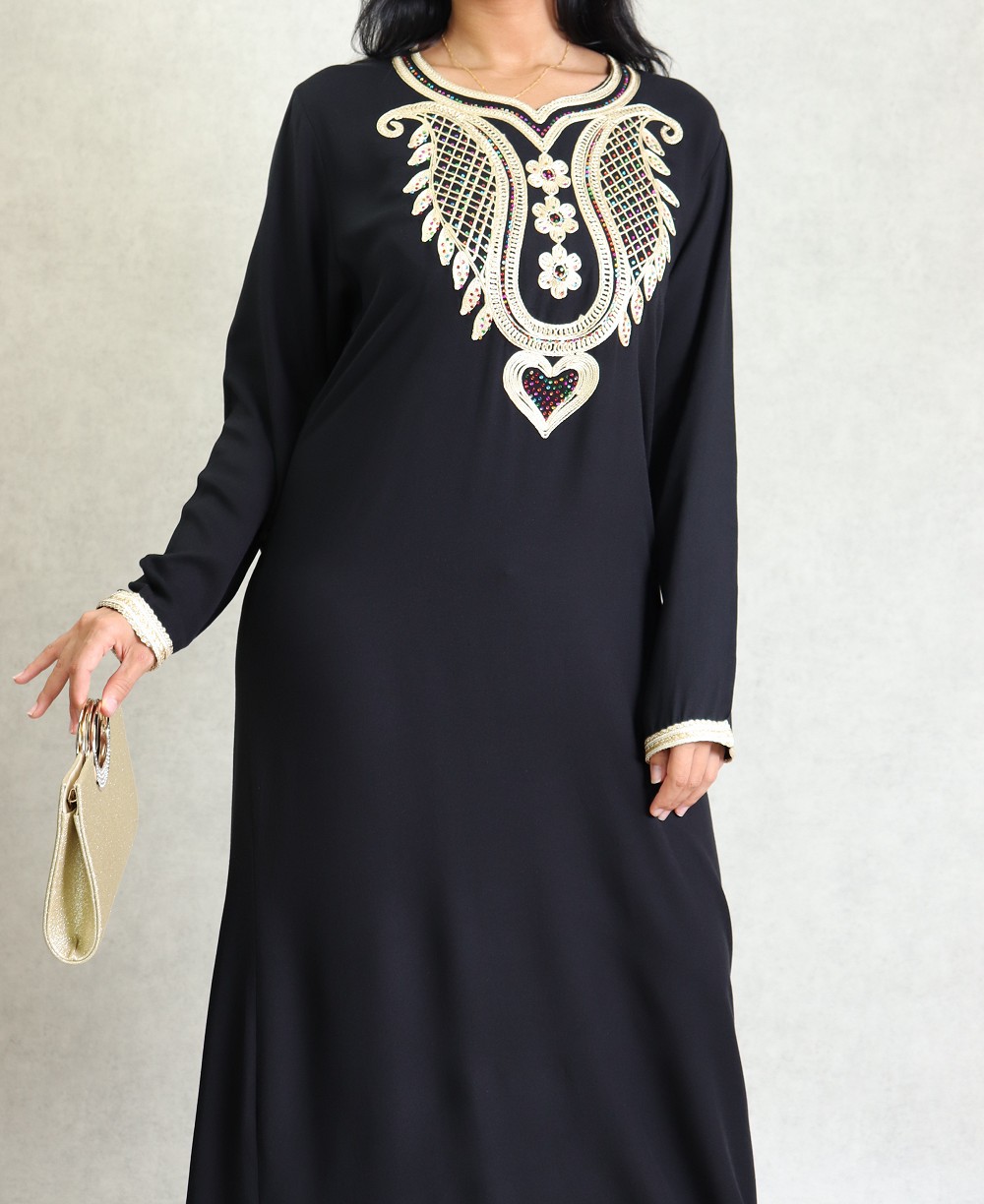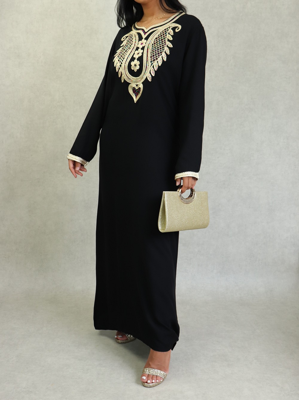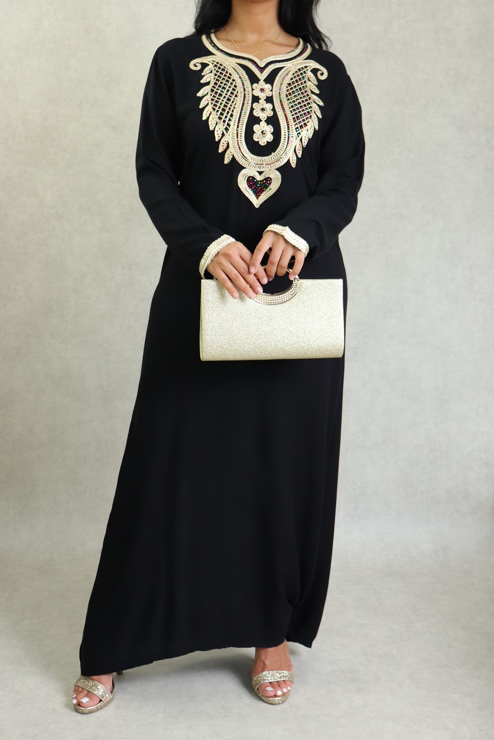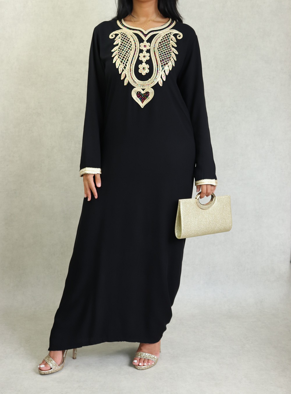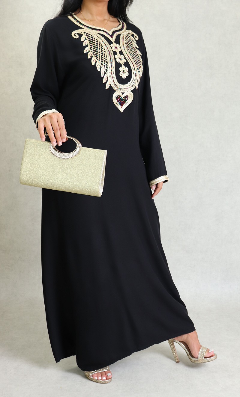 Robe longue, col en cœur, broderies orientale et des strasse multi-couleurs. Modèle classique et sobre, sera parfait pour le quotidien, son style et sa matière vous mettront tout de suite à l'aise.