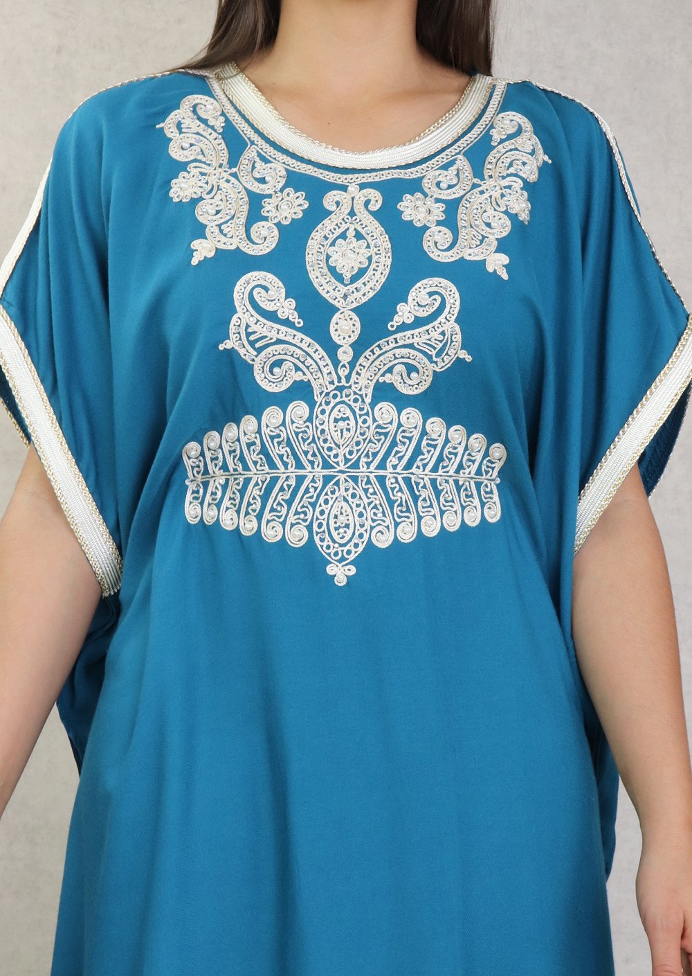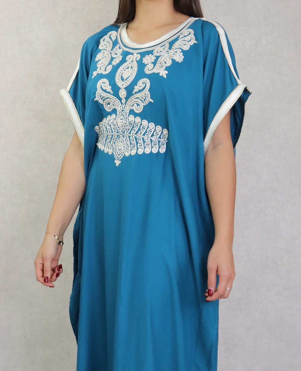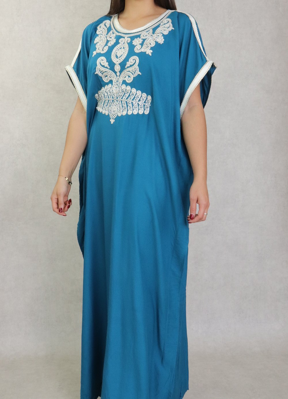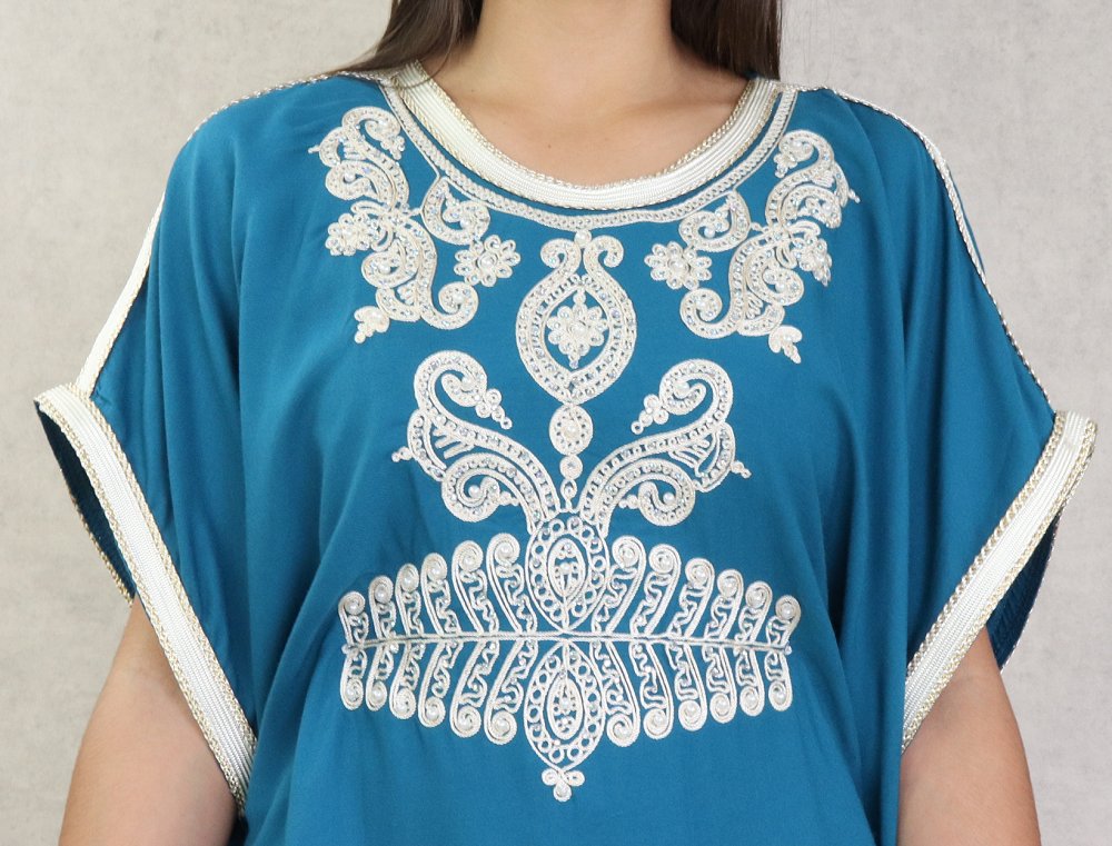 Robe orientale style arabe à manches courtes brodée avec perles et strass pour femme - Couleur bleu pétrole Vetement & Accessoire