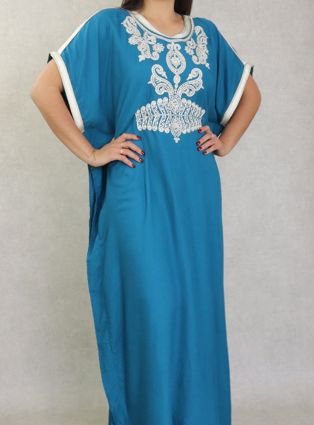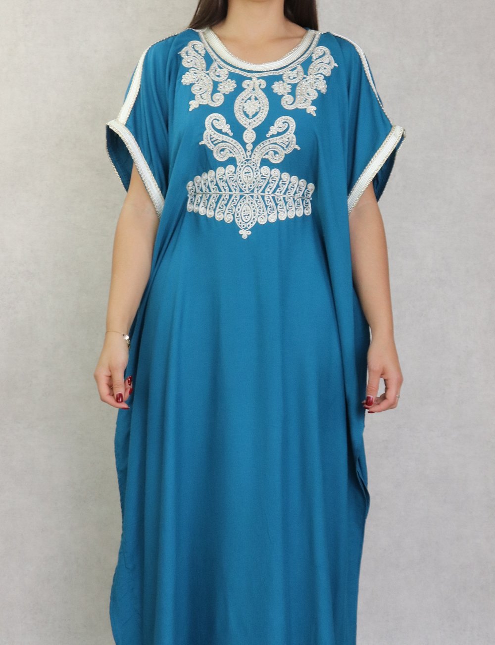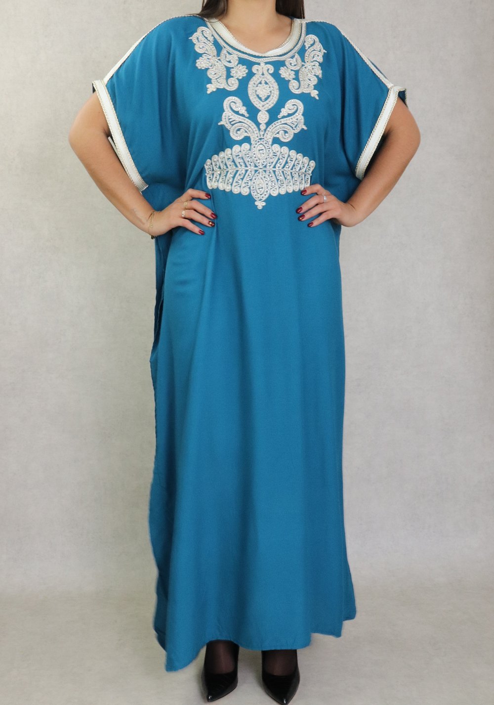 Robe orientale style arabe à manches courtes brodée avec perles et strass pour femme - Couleur bleu pétrole Vetement & Accessoire