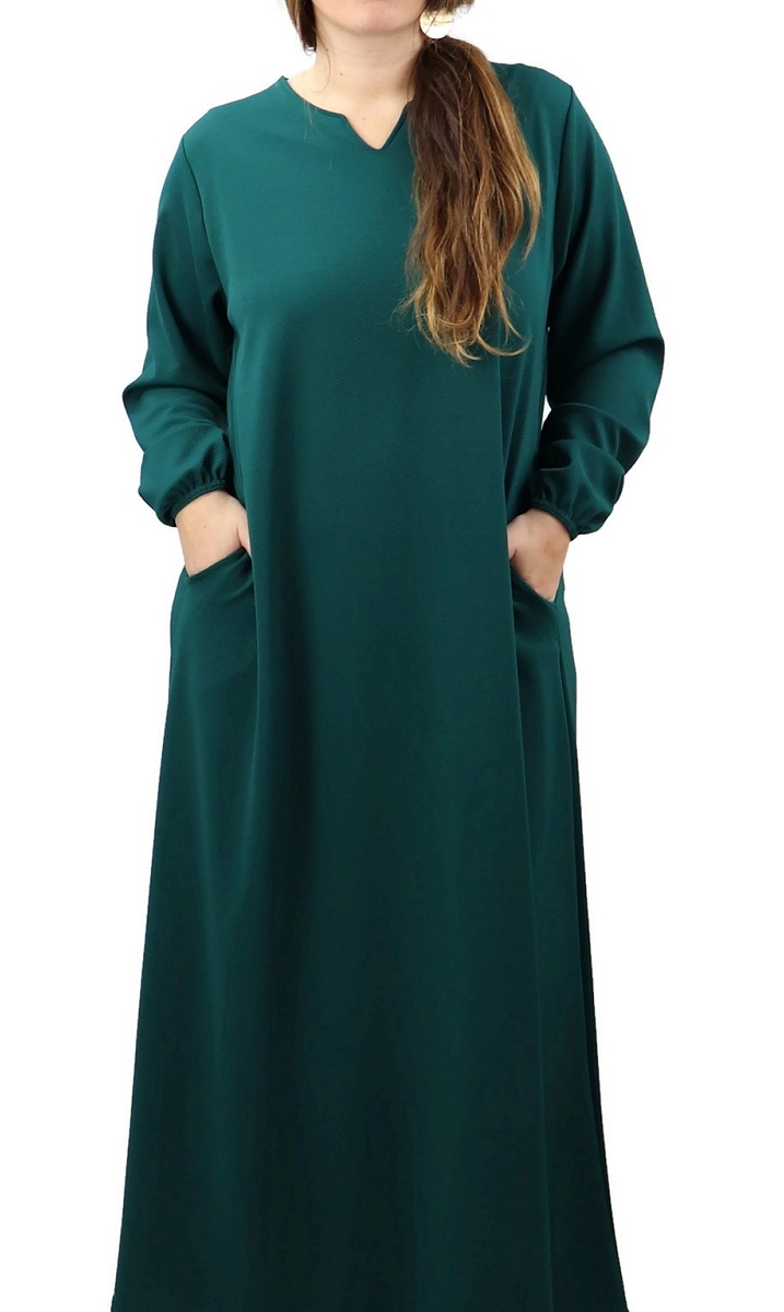 Robe évasée col tunisien, tissu épais non transparent légèrement extensible, poignets élastiques. Deux poches latérales.