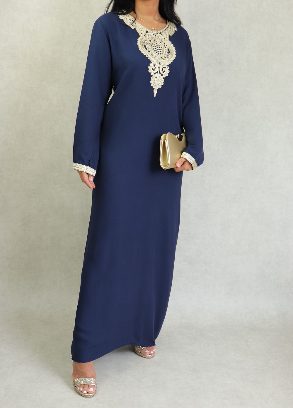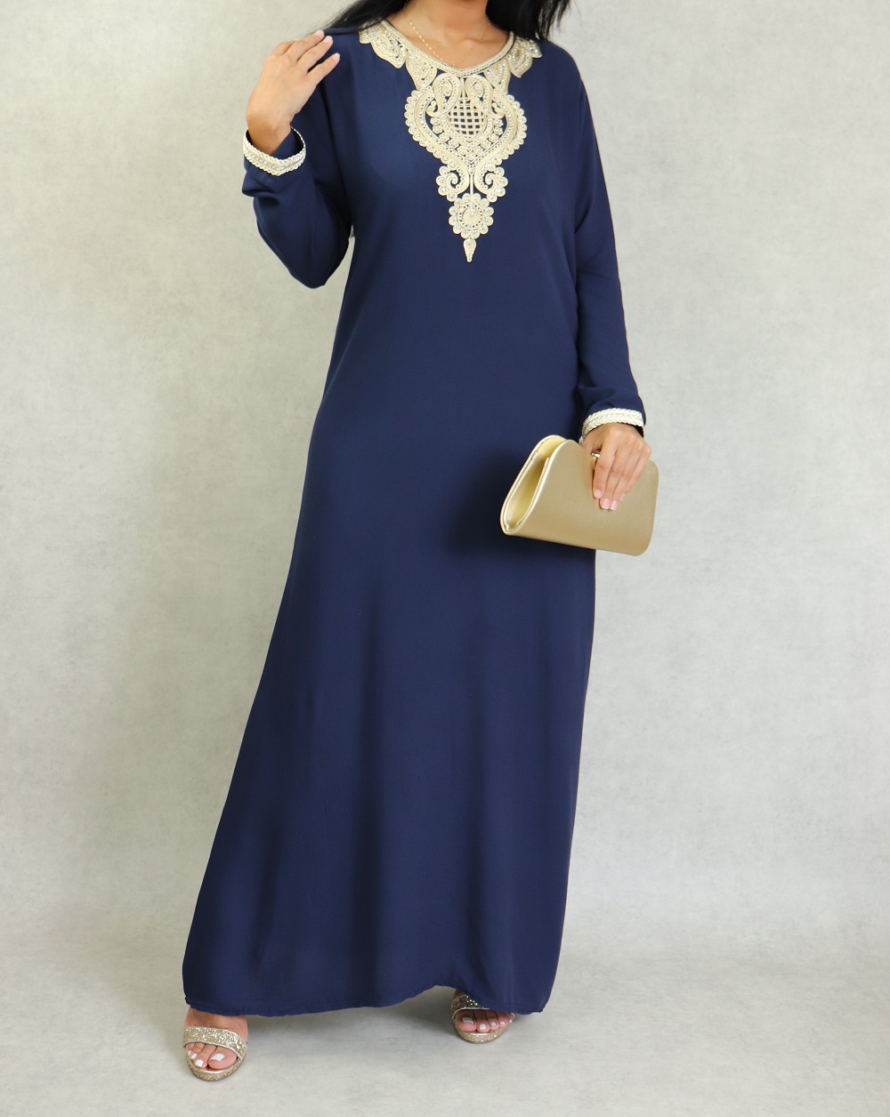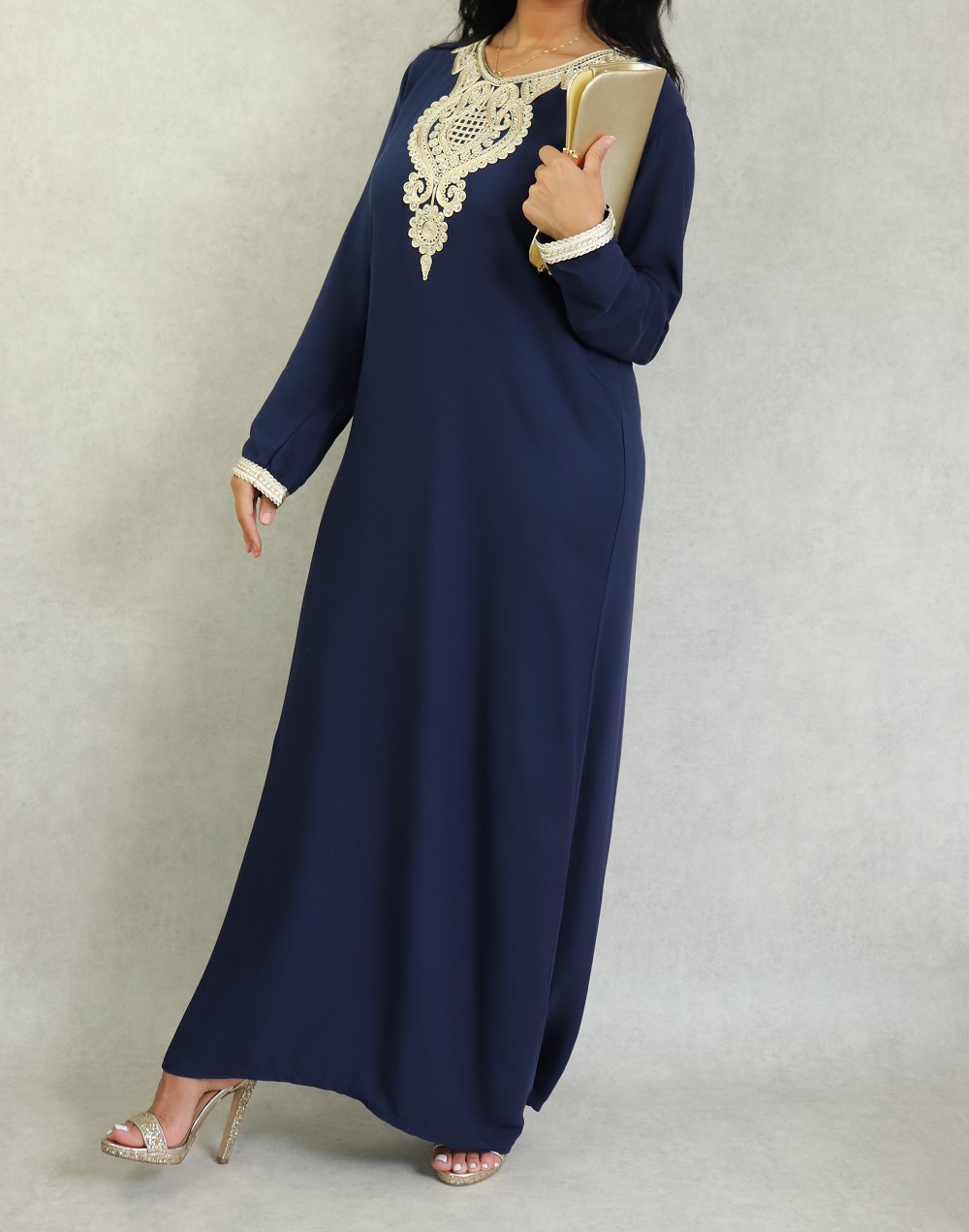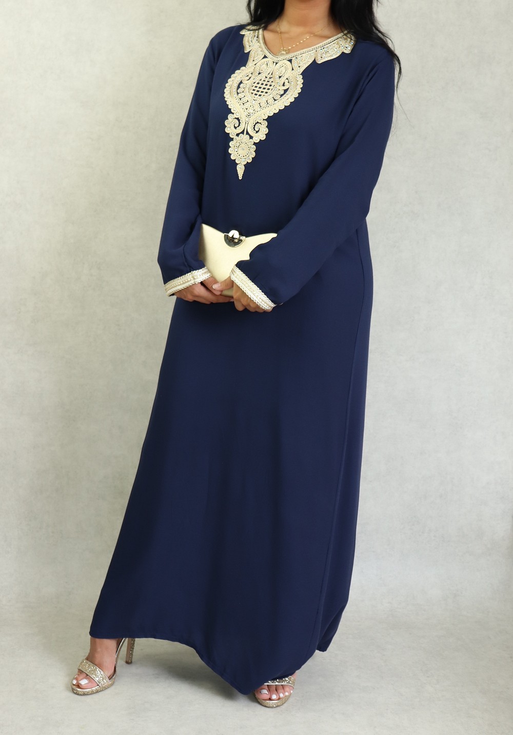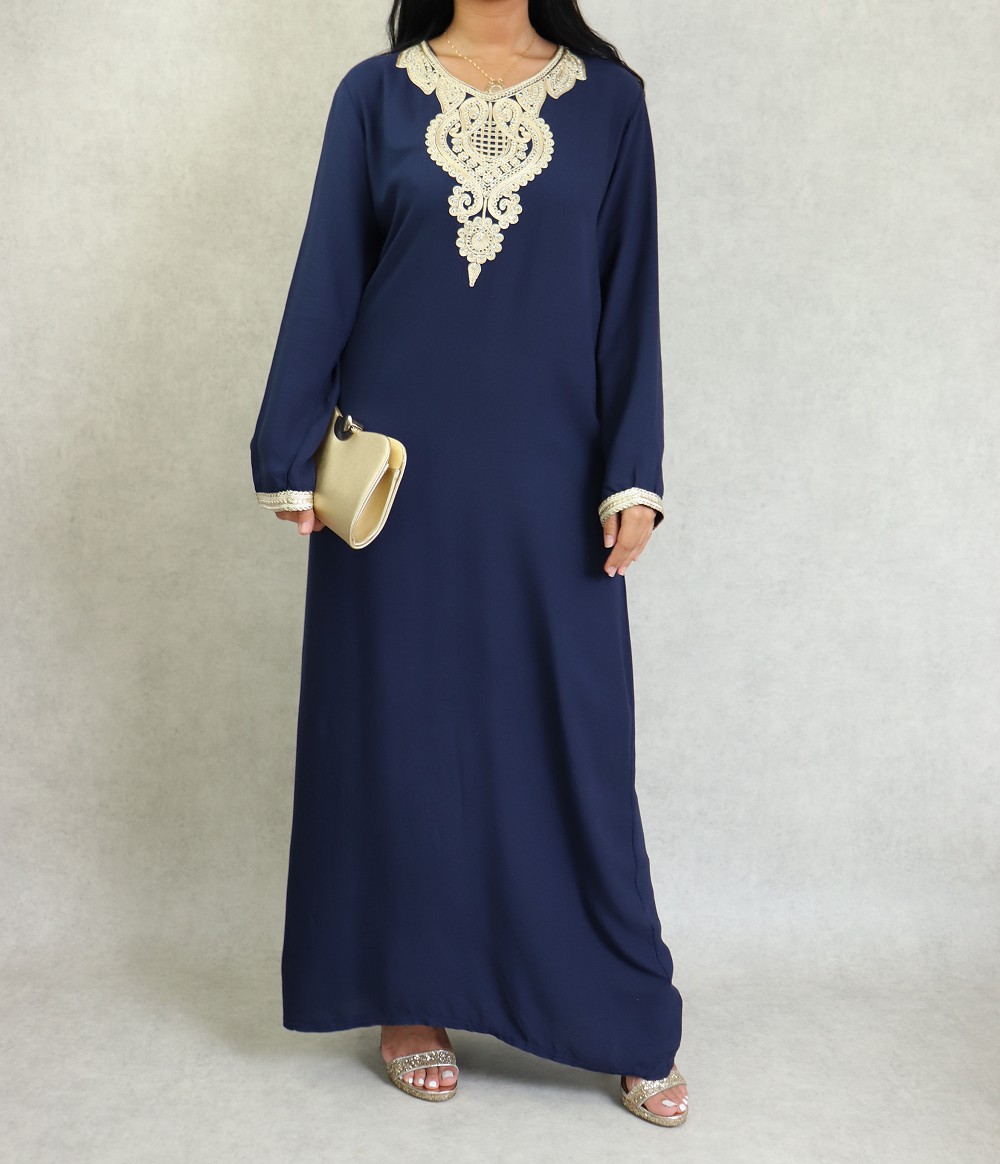 Magnifique robe style oriental à manches longues, avec strasse et borderies, un tissu épais (non transparent), fluide et doux au toucher (type coton/soie). Le double avantage de ce modèle est d'être confortable et élégant à la fois.