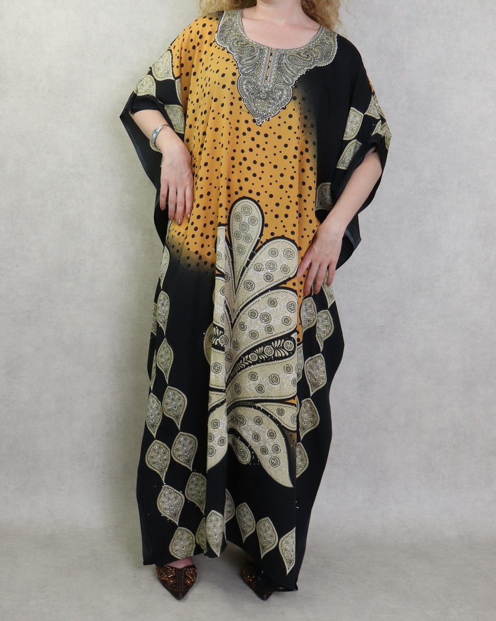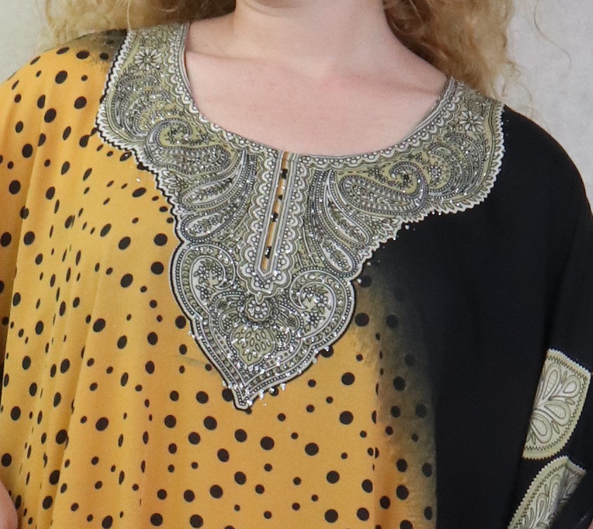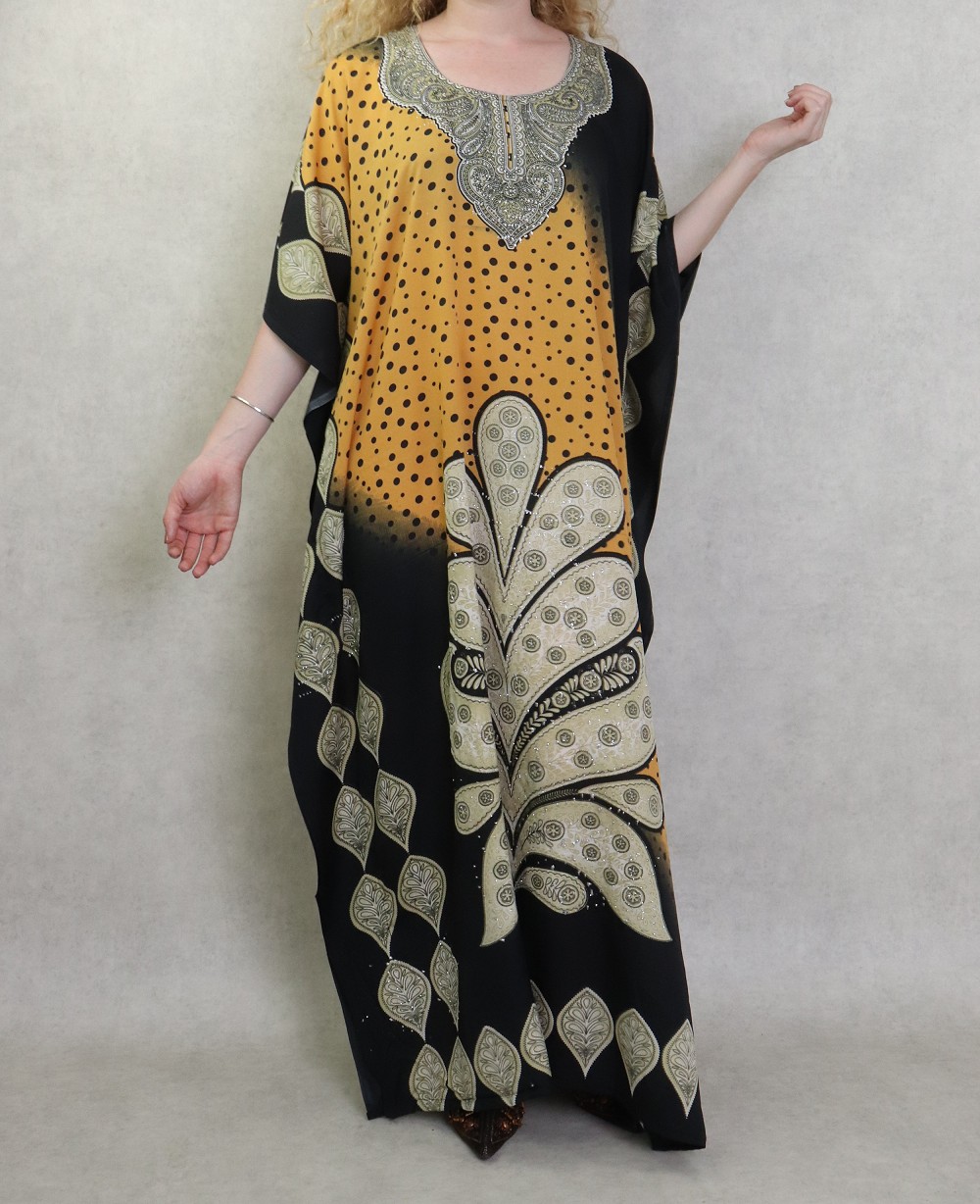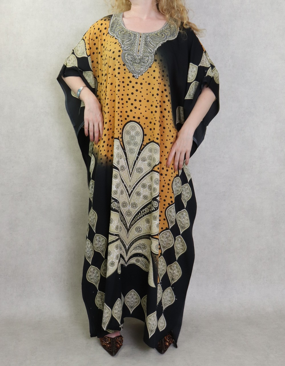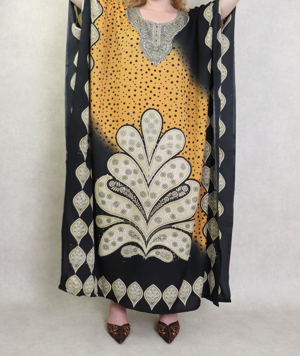 Robe longue manches courtes style oriental brodée avec strass et perle pour femme - Couleur Jaune moutarde - REF. 30813 (26.00 €)