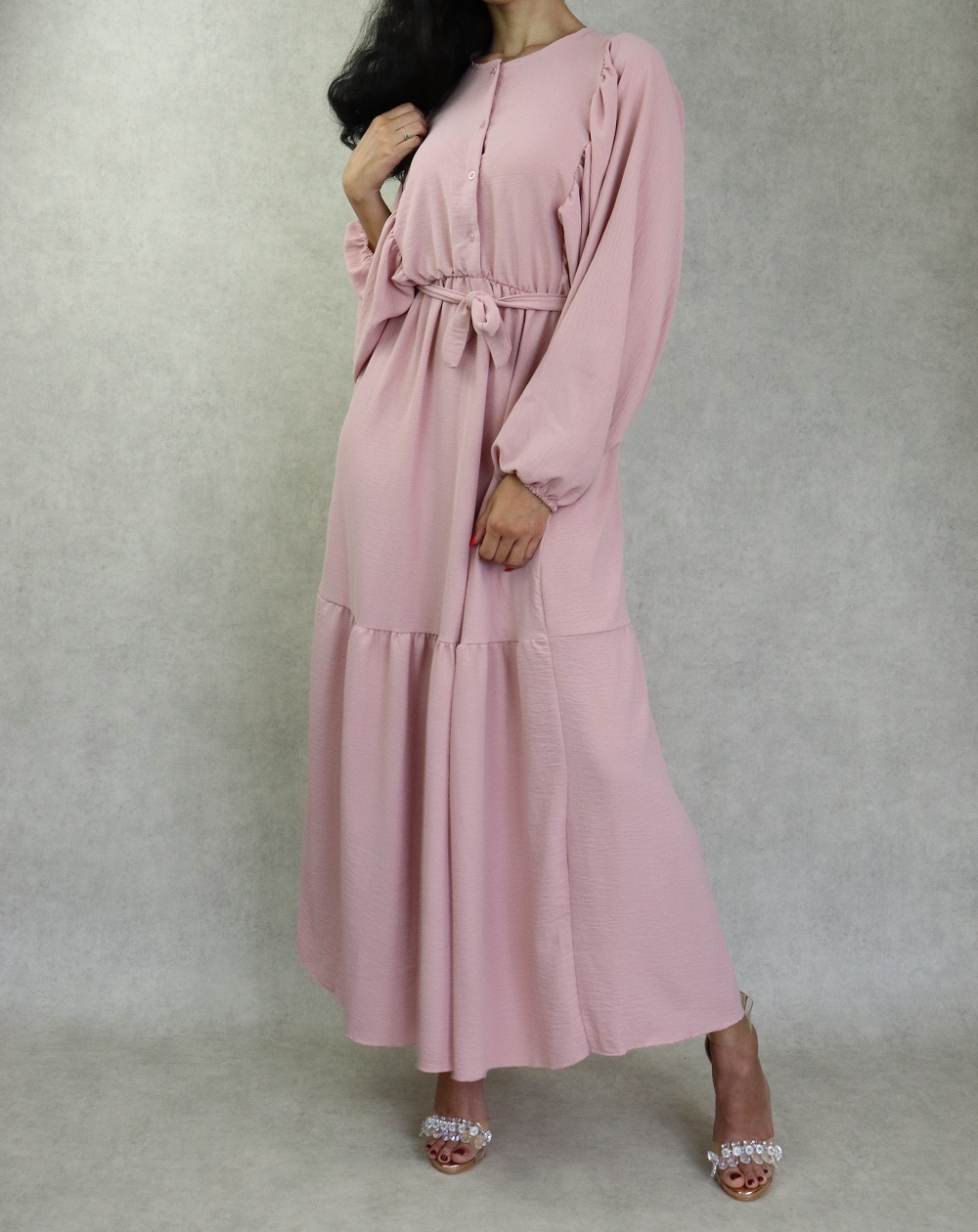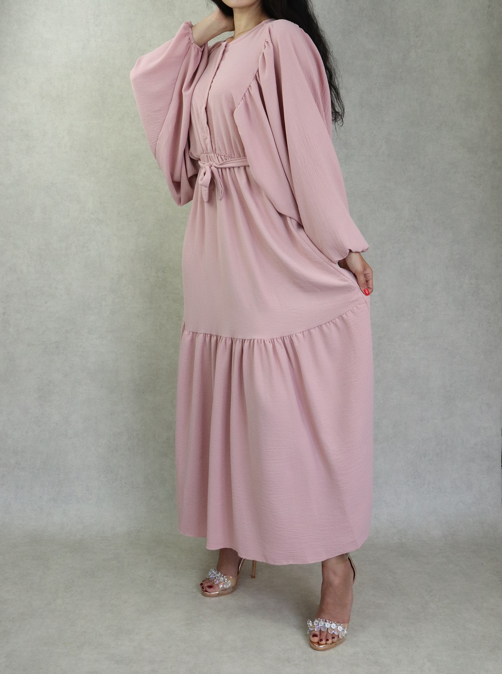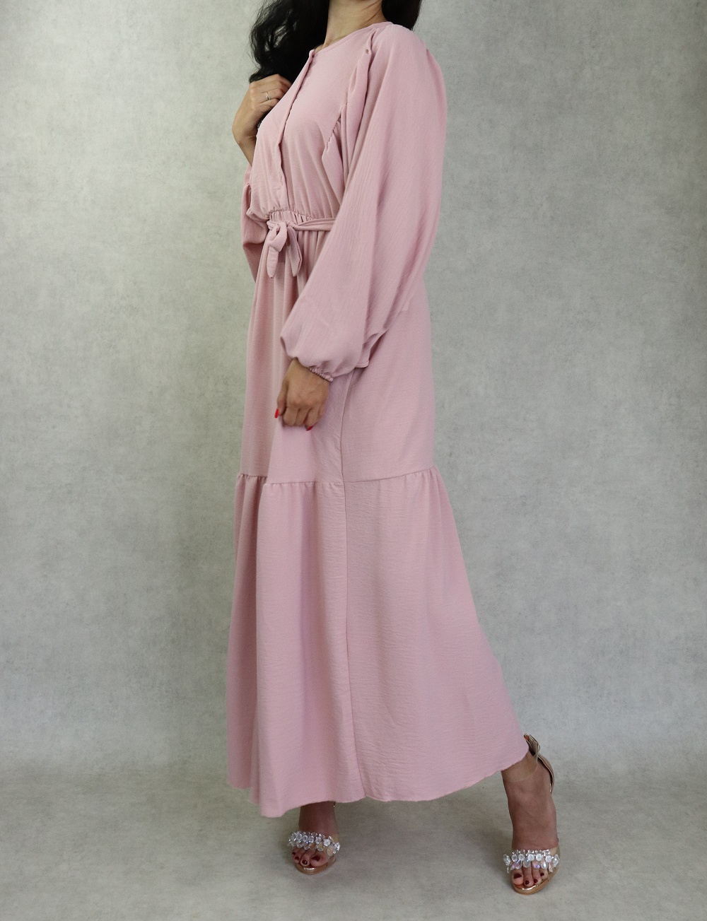 Robe longue bordée d’un volant pour femme (Vêtement style habillé pour hijab) - Couleur rose - REF. 35190 (26.00 €)