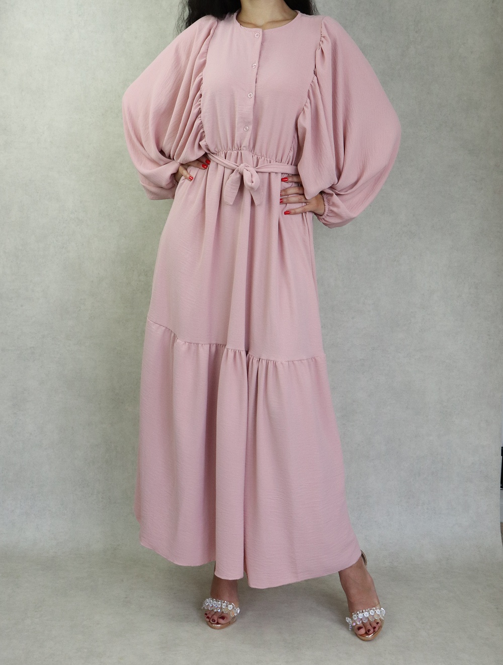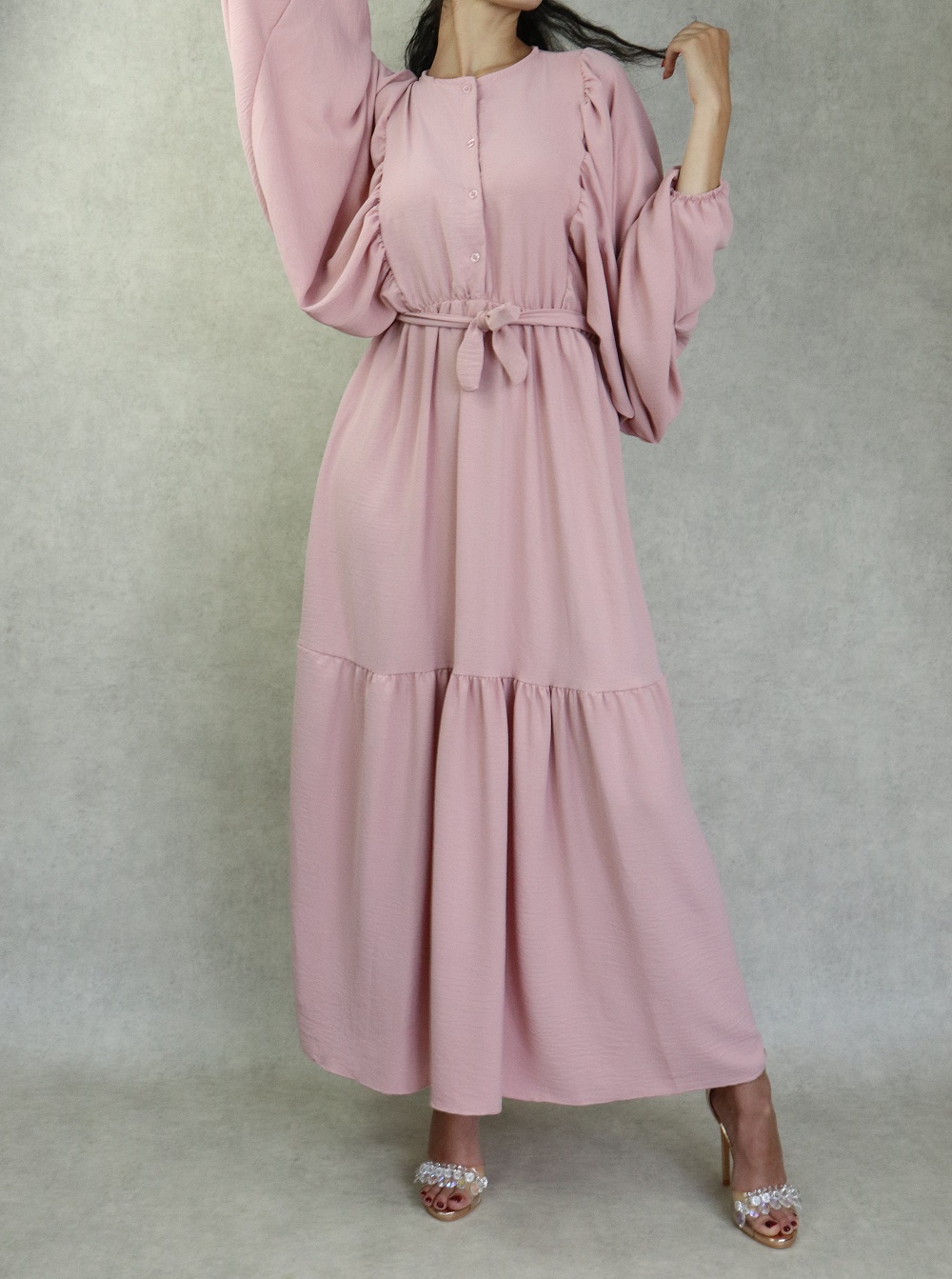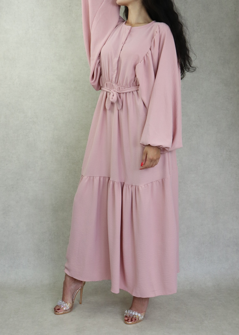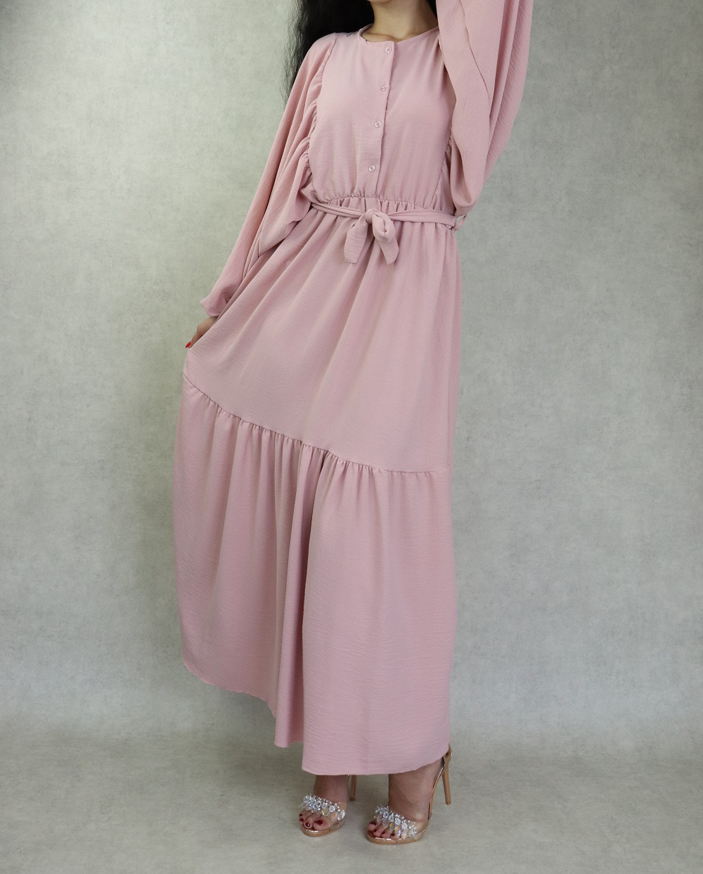 Robe longue bordée d’un volant pour femme (Vêtement style habillé pour hijab) - Couleur rose - REF. 35190 (26.00 €)