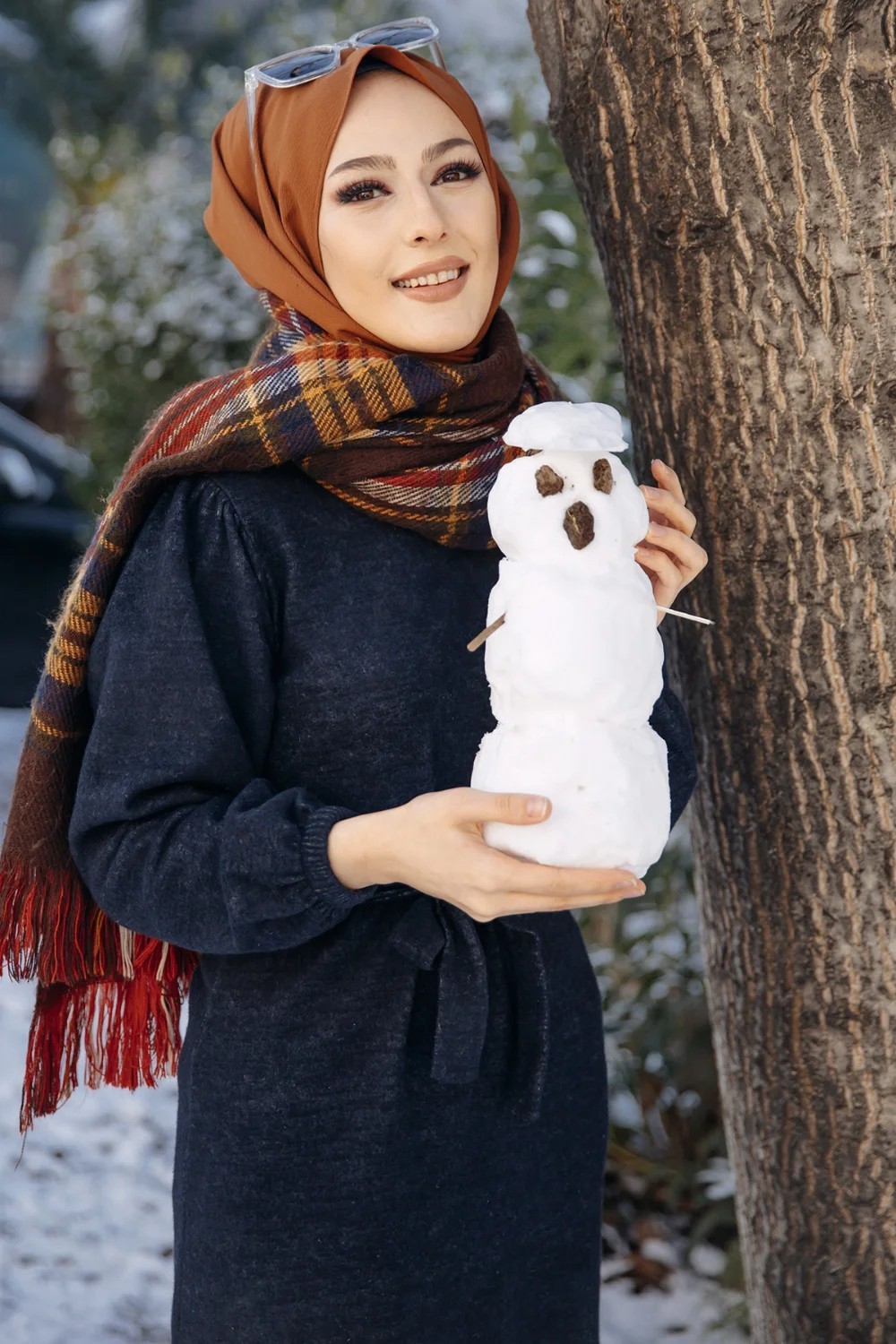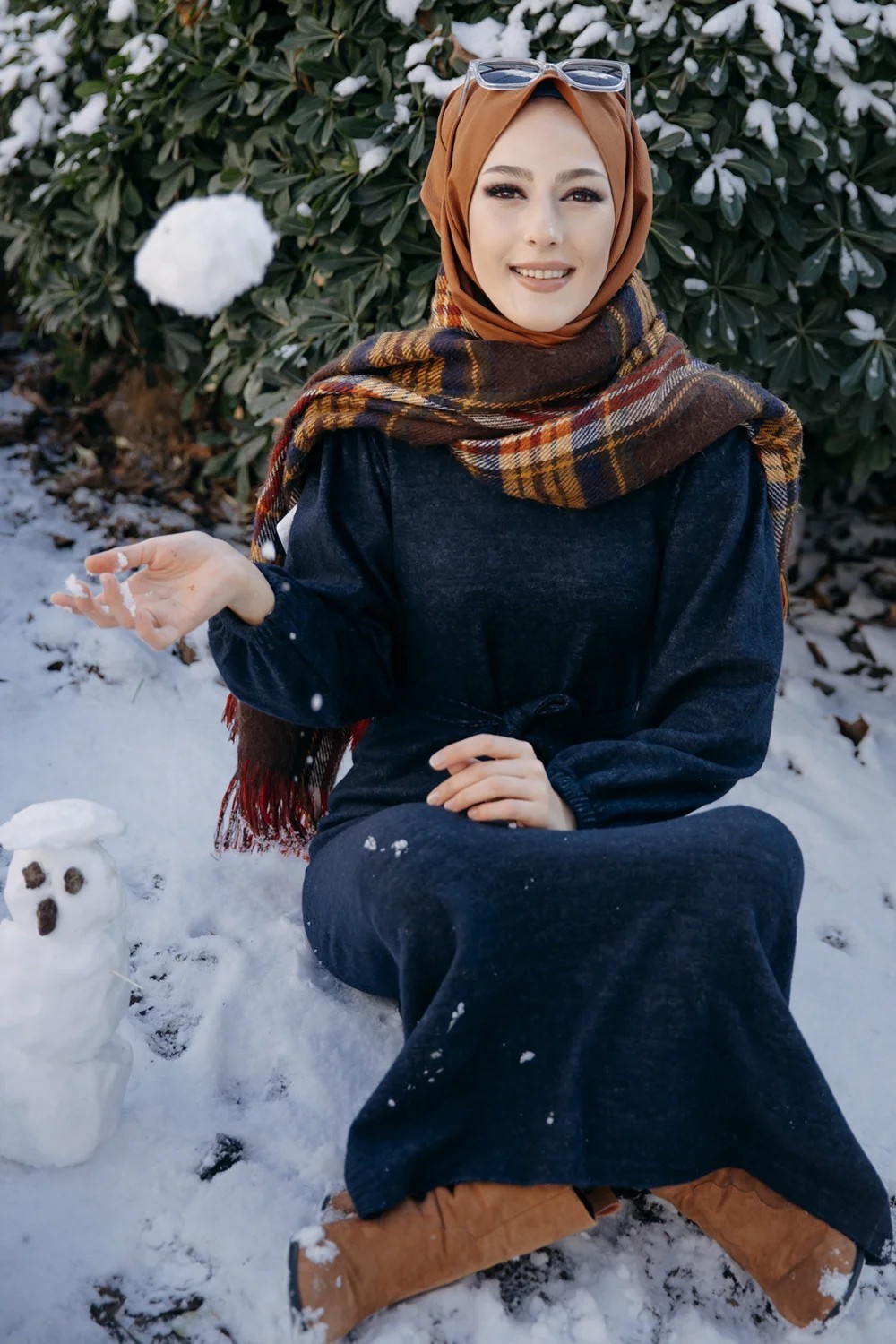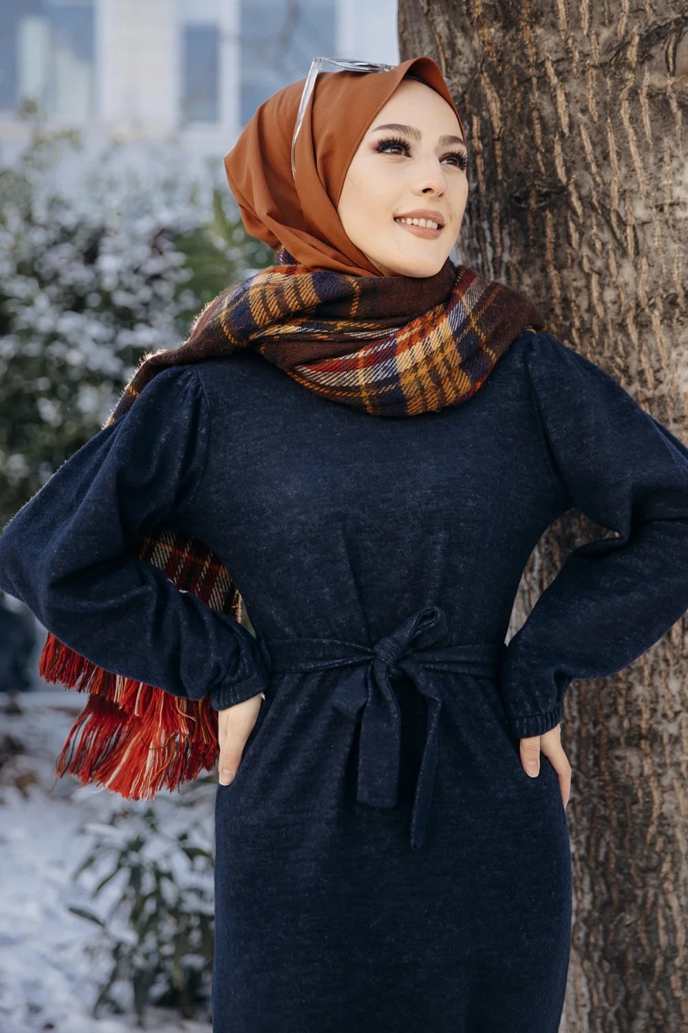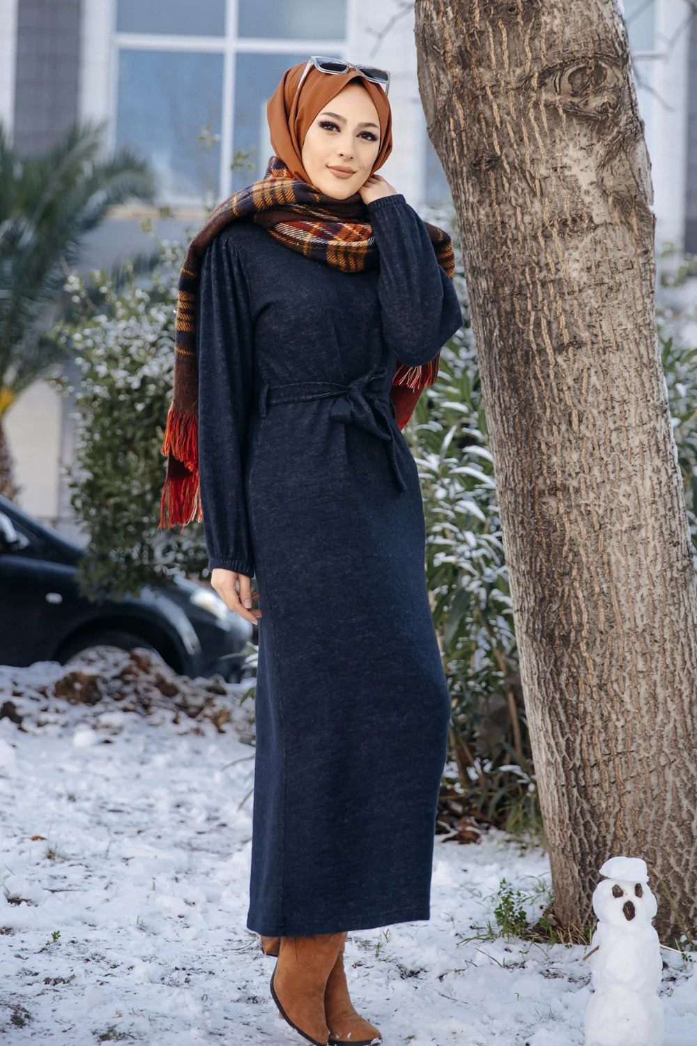 Robe tissu polaire avec ceinture (Vetement Hijab Saison Automne-Hiver) - Couleur bleu marine