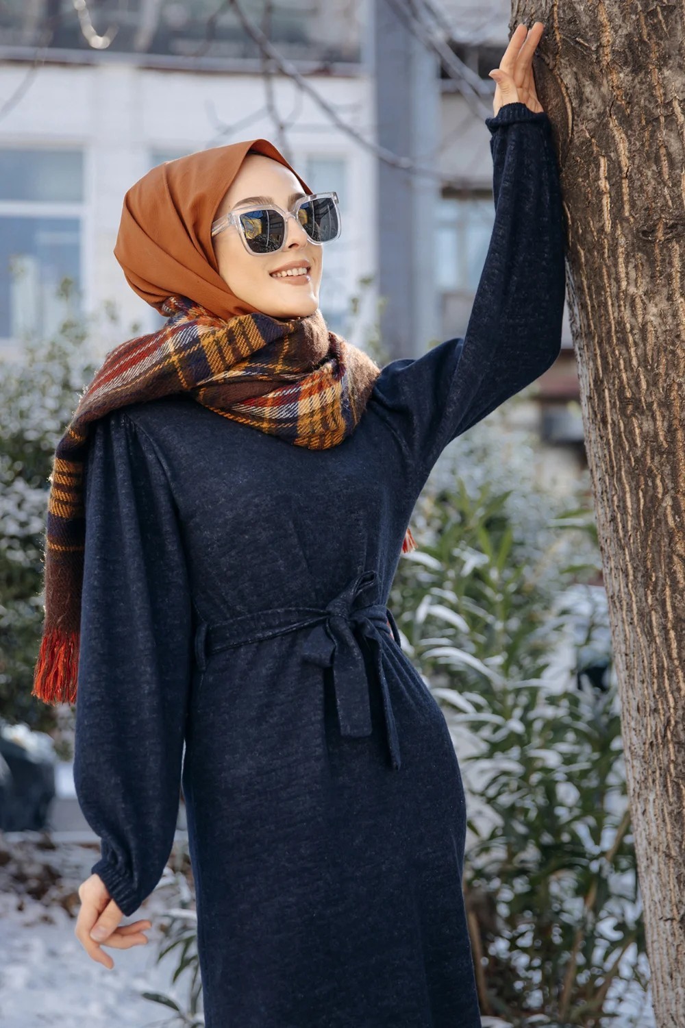Robe tissu polaire avec ceinture (Vêtement Hijab Saison Automne-Hiver) - Couleur bleu marine Vetement & Accessoire