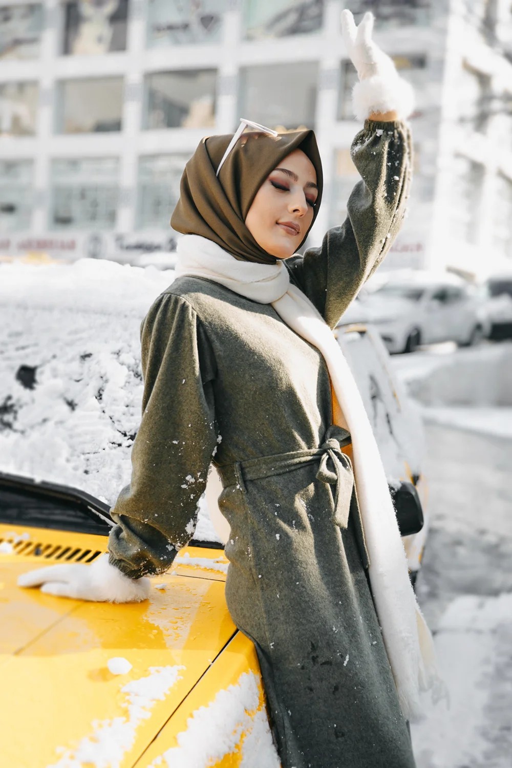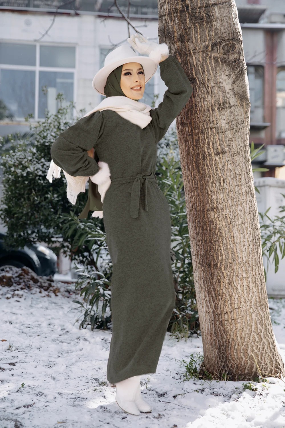 Robe tissu polaire avec ceinture (Vetement Hijab Saison Automne-Hiver) - Couleur kaki