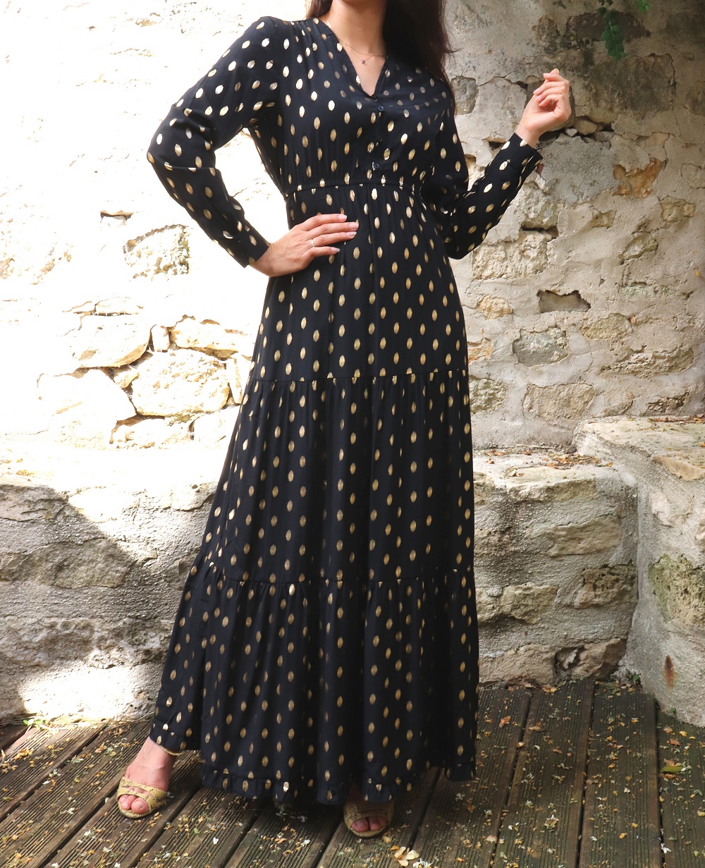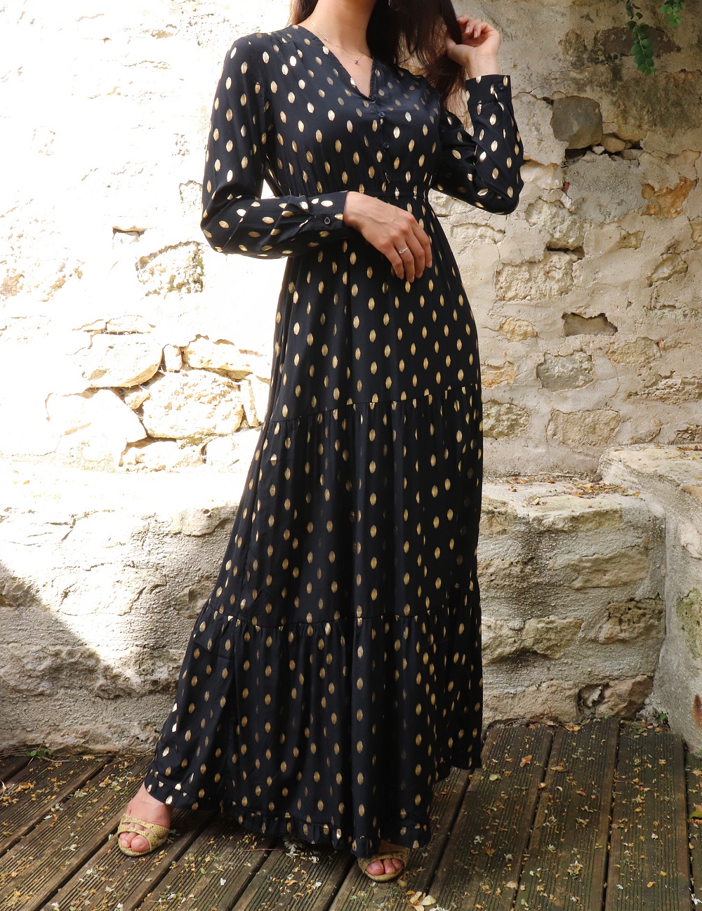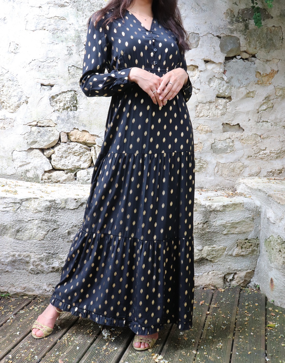 Robe très longue à volants pour femme - Couleur Noir avec motifs dorés Vetement & Accessoire