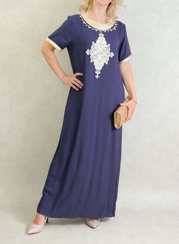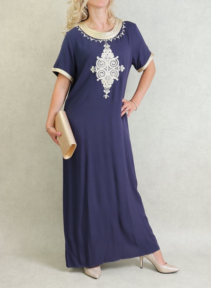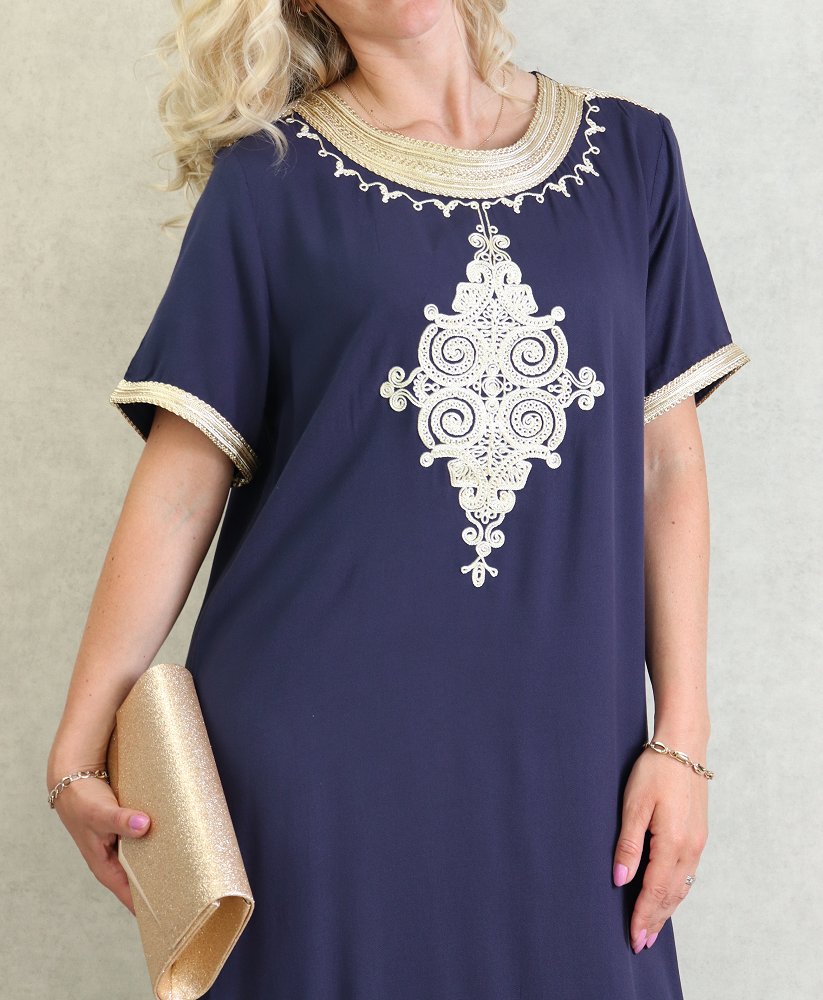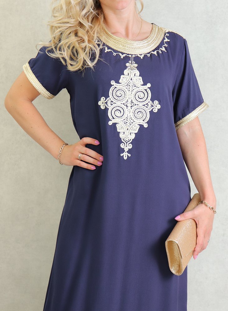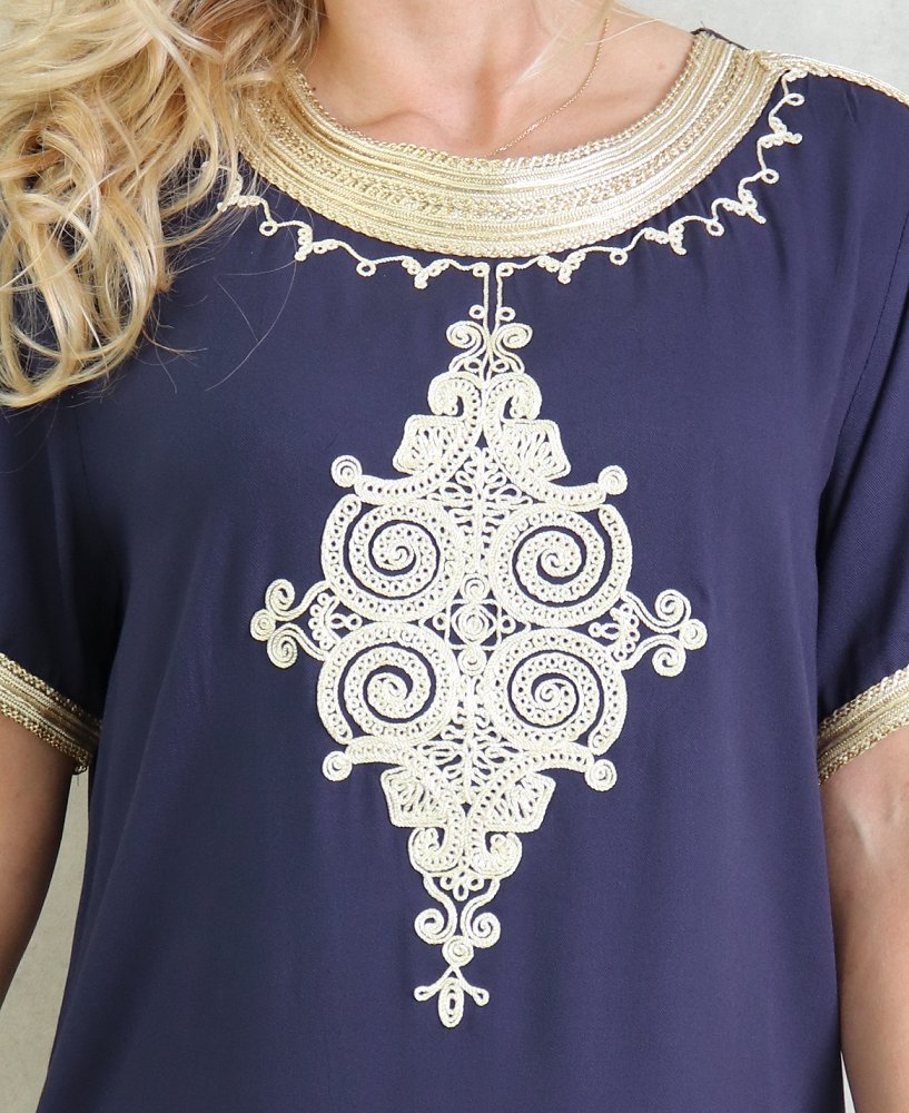 Robe tunisienne manches courtes avec broderies - Couleur Bleu Marine