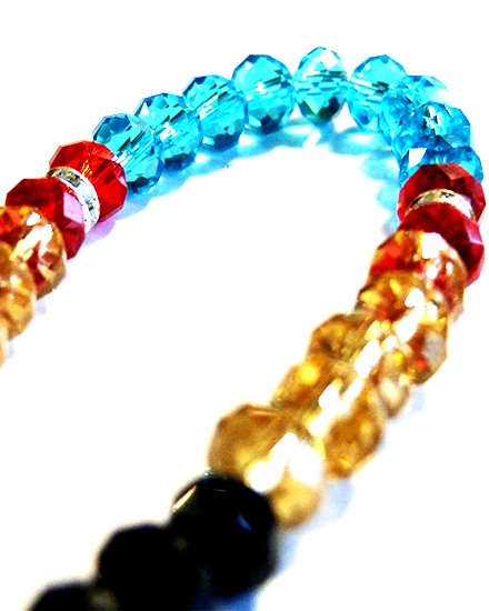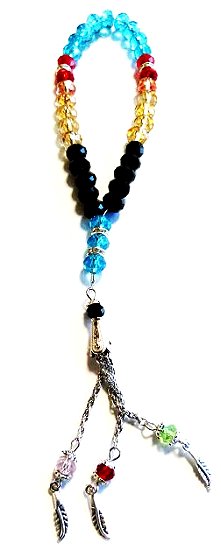 Magnifique Sabha (Chapelet) de 33 perles en cristal, de couleur bleue, noire, jaune et rouge avec décorations métalliques argentées. Photo non contractuelle.