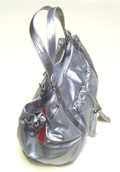 Sac à main argenté en simili cuir, il se porte sur l'épaule ou à la main. Il est muni d'une poche zippée au dos et d'autre autre au devant qui se referme avec un bouton pression et ornée d'un pompon. Il se ferme en fermeture éclair pour plus de sécurité.