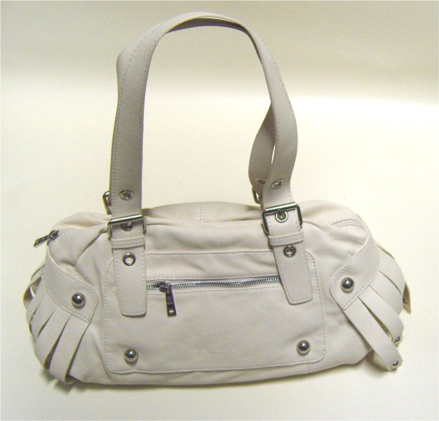 Sac à main beige léger en simili cuir. Il se porte sur l'épaule et se ferme en fermeture éclair. Il est muni d'une poche zippée au devant.