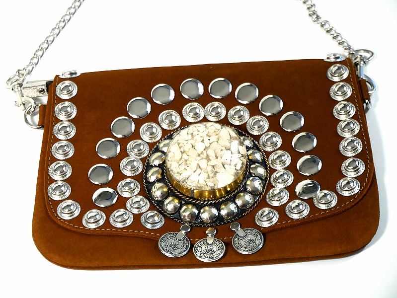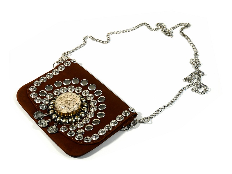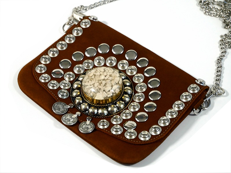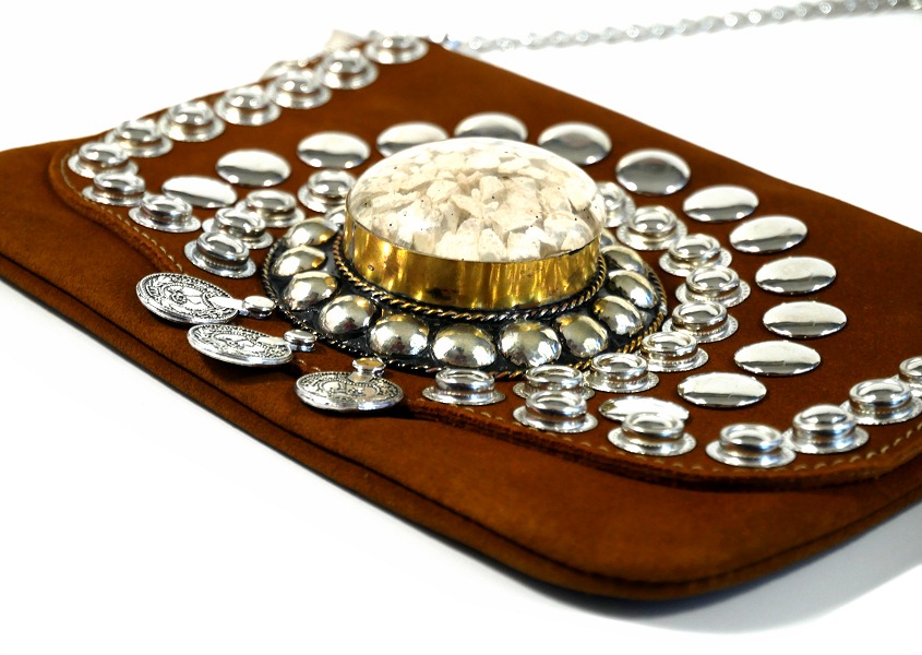 Ornement de pierres coulées dans un bloc de résine, médaillons et inserts métal, hanse en chaîne métal, poche intérieure fermée par une fermeture.
