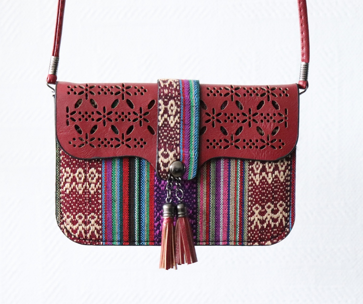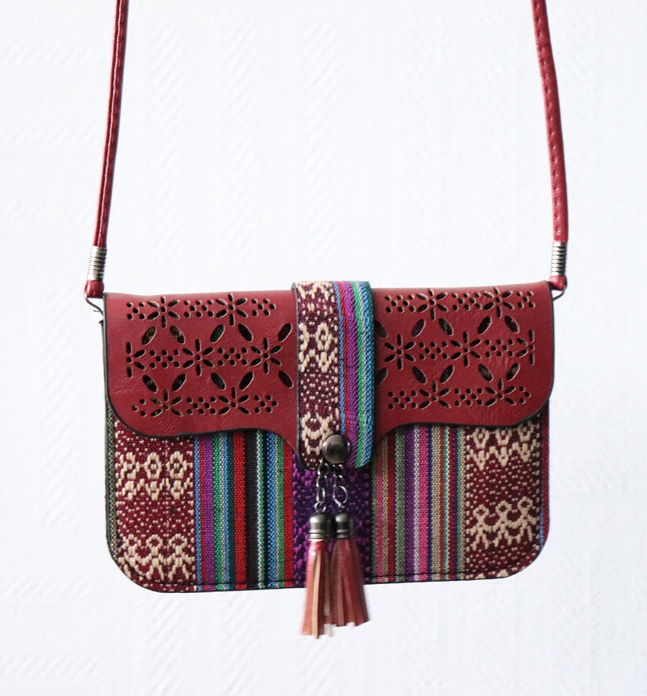 Un très joli sac à main pochette ethnique, plein de couleurs, confectionné avec d' anciennes broderies d' Inde de l' Ouest et du Pakistan. Fermeture à pression. Livré avec une bandoulière en semi cuir.