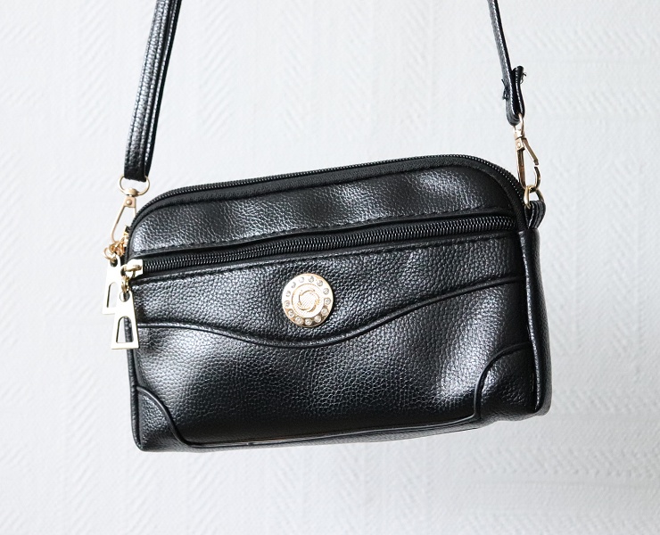 Sac souple, poche extérieure avec fermeture a l'avant et au dos, une poche zippée à l'intérieur. Décoré à l'avant d'un petit médaillon avec diamants.