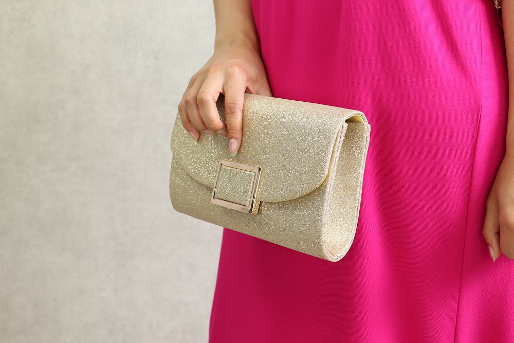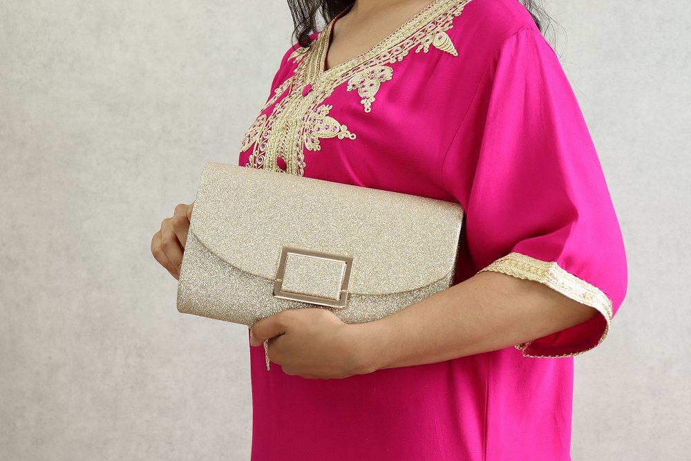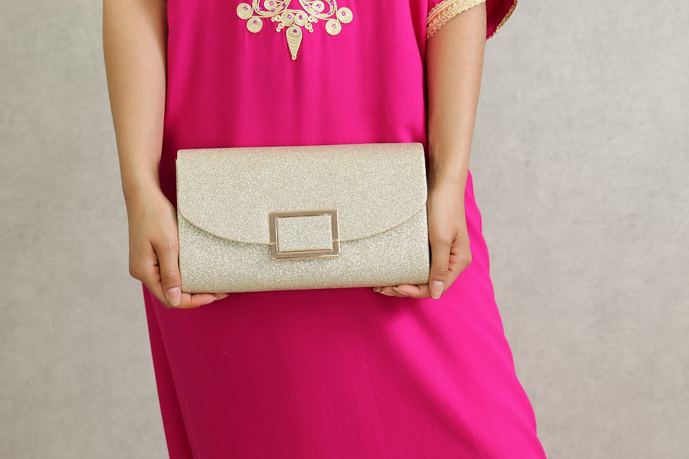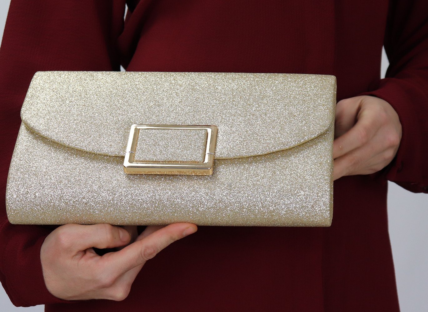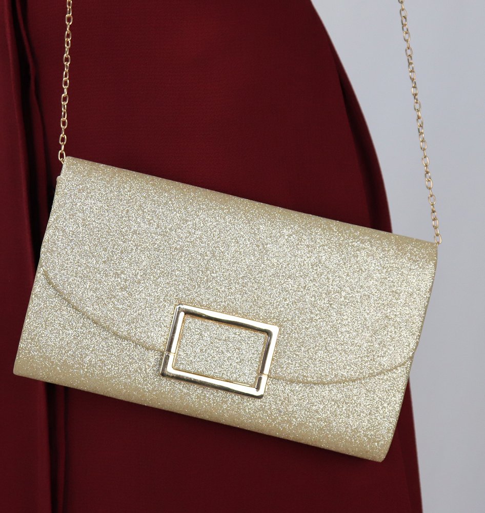 Grand sac à main pochette pour femme brillant avec micro strass. Il se porte à la main ou à l'épaule grâce à sa bandoulière en chaînette amovible. Fermeture à rabat avec bouton-pression. Partie métallique au niveau de la fermeture.
