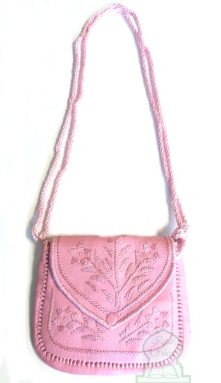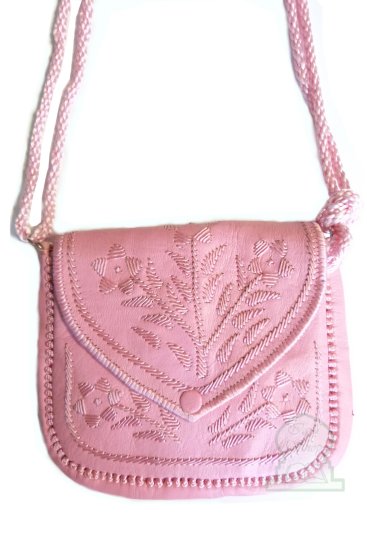 Sac artisanal marocain en cuir de couleur rose avec de jolis motifs cousus - REF. 17545 (20.00 €)
