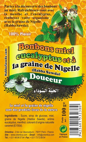 Ingrédients : Sucre, sirop de glucose, miel, graine de Nigelle (Habba Sawda), arôme eucalyptus, menthol, colorant d’origine naturelle caramel.