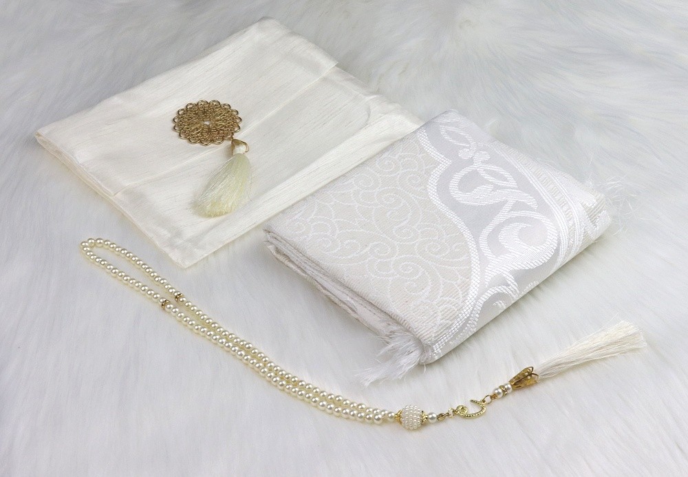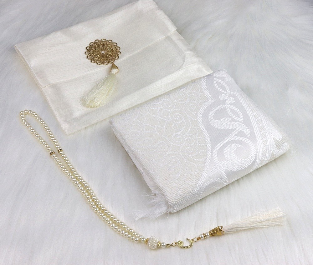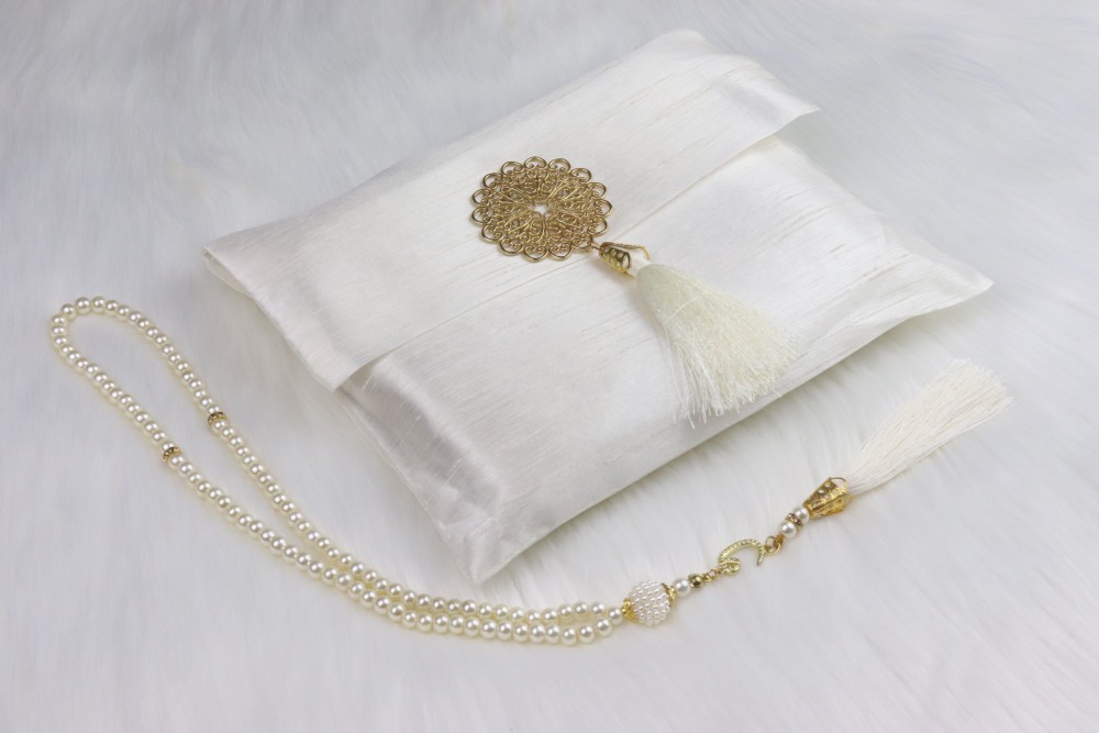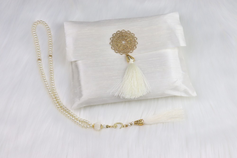 Belle sacoche cadeau en tissu brillant avec médaillon métallique doré et son pompon en sabra contenant un tapis brodé (taille adulte) et un chapelet (Sebha) de 99 perles assorties.