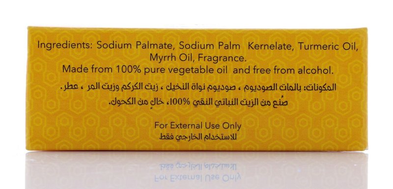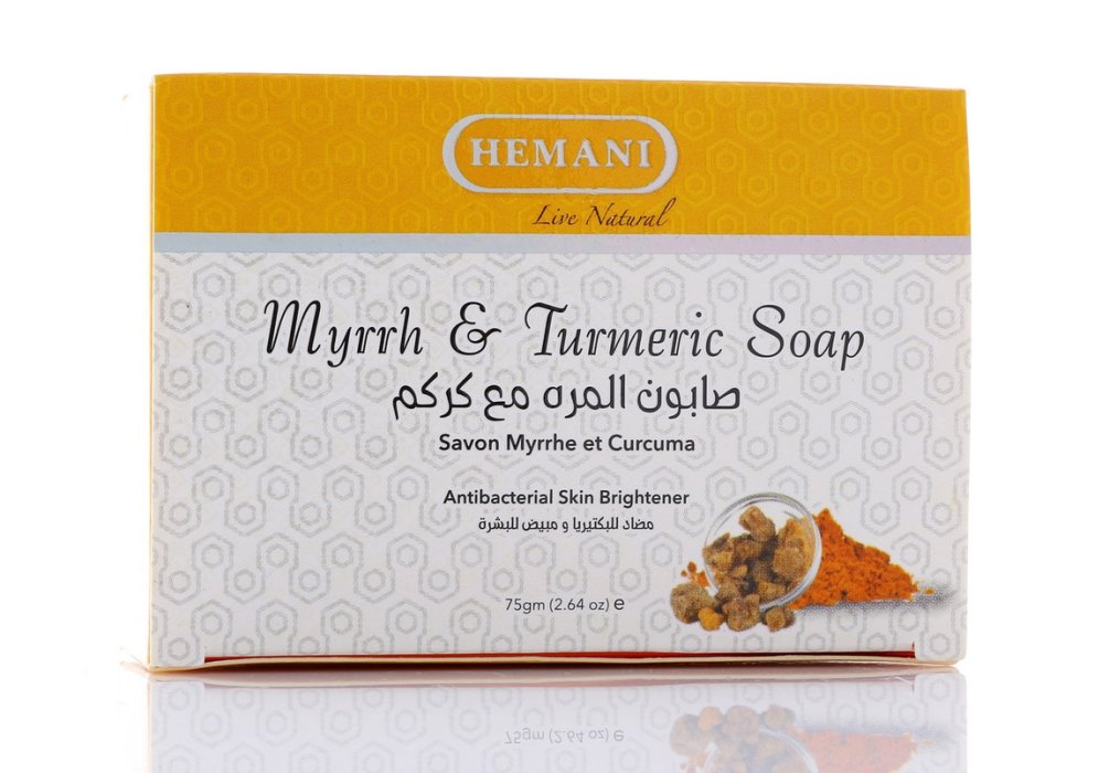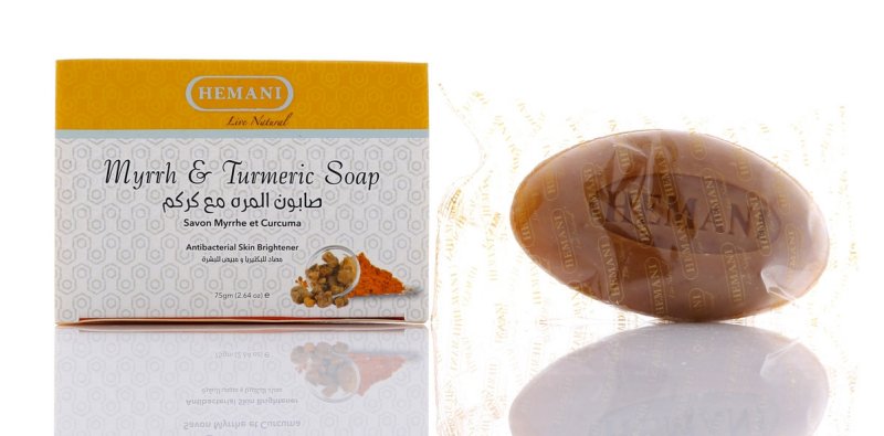 Savon éclaircissant et antibactérien au curcuma et à la myrrhe. Aide à fournir de la vitamine E pour hydrater et revitaliser les cellules de la peau.