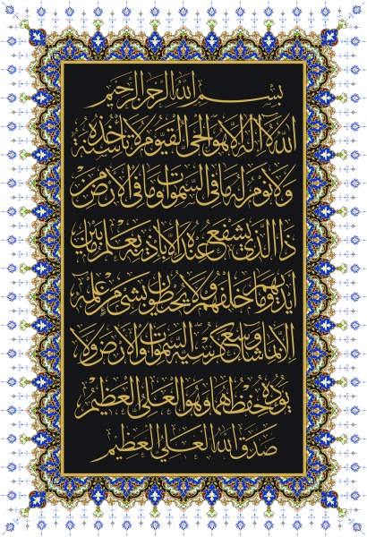 اللهُ لاَ إِلَهَ إِلاَّ هُوَ الْحَيُّ الْقَيُّومُ لاَ تَأْخُذُهُ سِنَةٌ وَلاَ نَوْمٌ لَّهُ مَا فِي السَّمَاوَاتِ وَمَا فِي الأَرْضِ مَن ذَا الَّذِي يَشْفَعُ عِنْدَهُ إِلاَّ بِإِذْنِهِ يَعْلَمُ مَا بَيْنَ أَيْدِيهِمْ وَمَا خَلْفَهُمْ وَلاَ يُحِيطُونَ بِشَىْءٍ مِّنْ عِلْمِهِ إِلاَّ بِمَا شَاء وَسِعَ كُرْسِيُّهُ السَّمَاوَاتِ وَالأَرْضَ وَلاَ يَؤُودُهُ حِفْظُهُمَا وَهُوَ الْعَلِيُّ الْعَظِيمُ