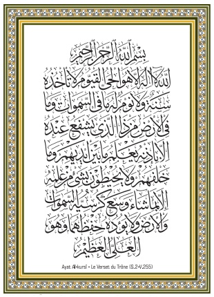 Allâhu lâ ilâha illâ huwa-l-hayyu-l-qayyûm. Lâ ta'khudhuhu sinatun wa lâ nawm, lahu mâ fî s-samâwâti wa mâ fî-l-ard. Man dhâ l-ladhî yashfacu cindahu illâ bi-idhnihi. Yaclamu mâ bayna aydîhim wa mâ khalfahum. Wa lâ yuhîtûna bi-shay'in min cilmihi illâ bi-mâ shâ'a. Wasica kursiyyuhu s-samâwâti wa-l-ard. Wa lâ ya'ûduhu hifzuhumâ, wa huwa-l-caliyyu-l-cazîm.