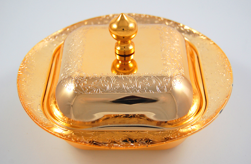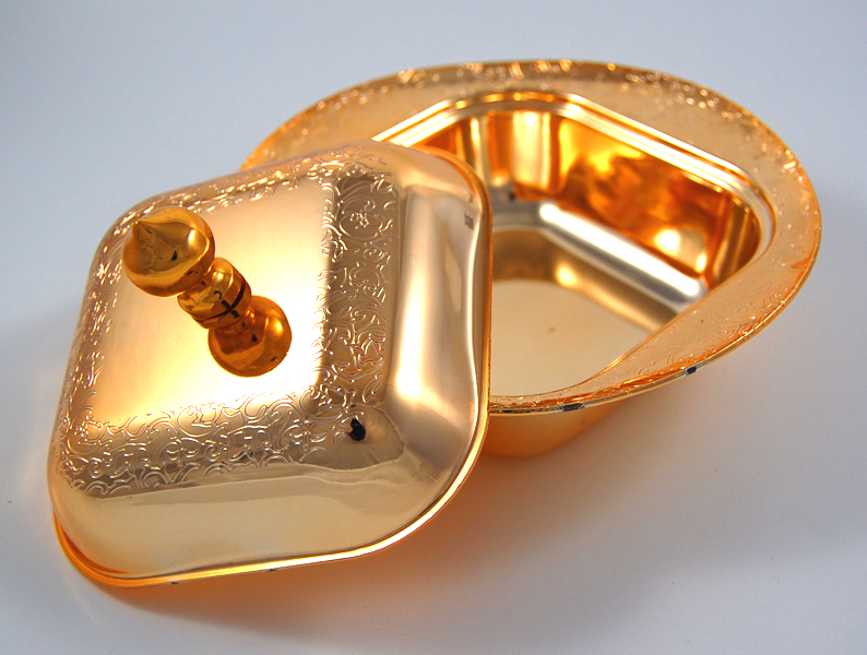 Sucrier, boite à bonbon (Récipient métallique avec couvercle) doré, qui peut servir d'accessoire pour le rangement d'aliments ou de petits objet tels que des bijoux, tout comme il peut servir d'objet décoratif comme bibelot sur une table ou sur des étagères .