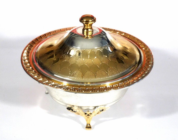 Très beau sucrier, boite à bonbon (Récipient métallique rond avec couvercle argenté avec parties dorées) peut également servir à présenter des fruits secs, des dattes, etc.