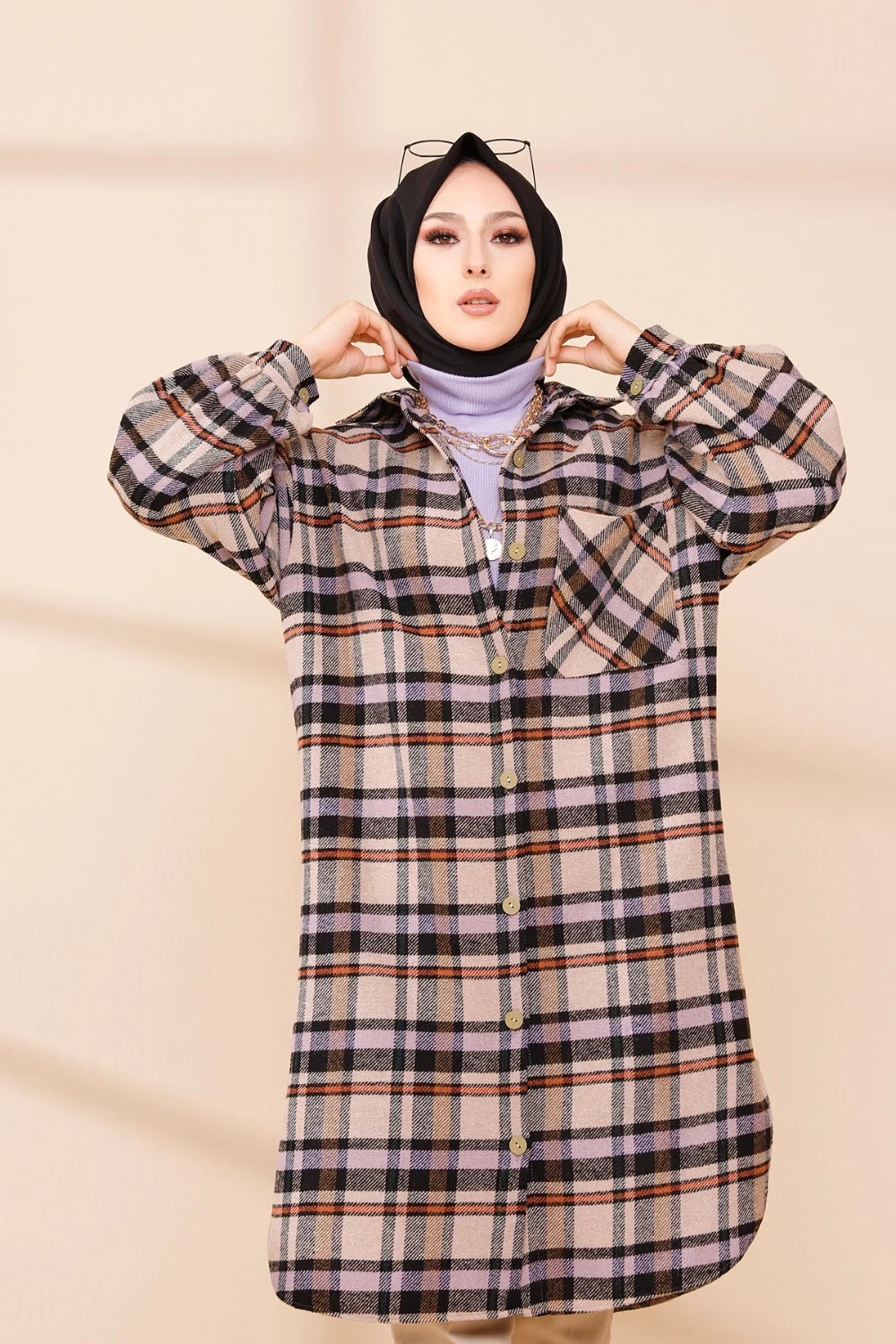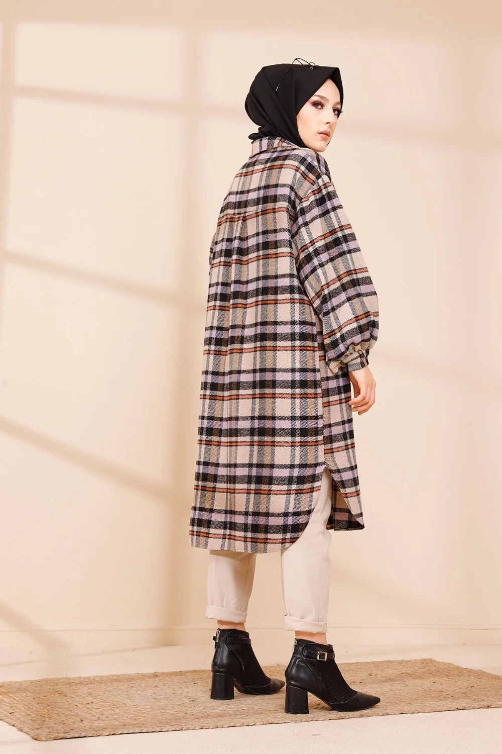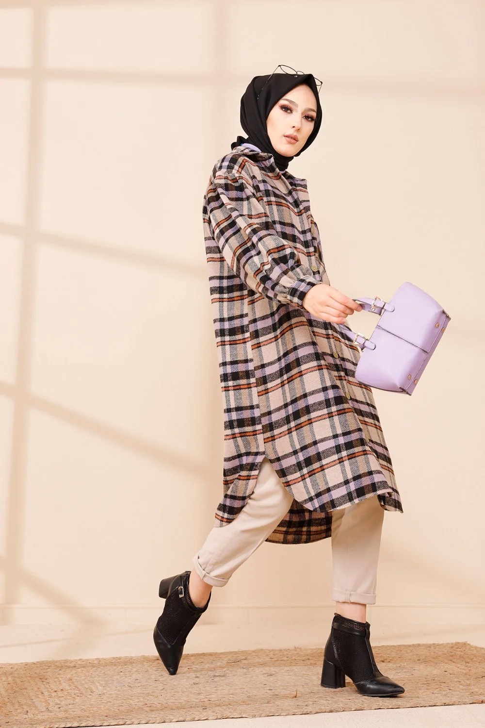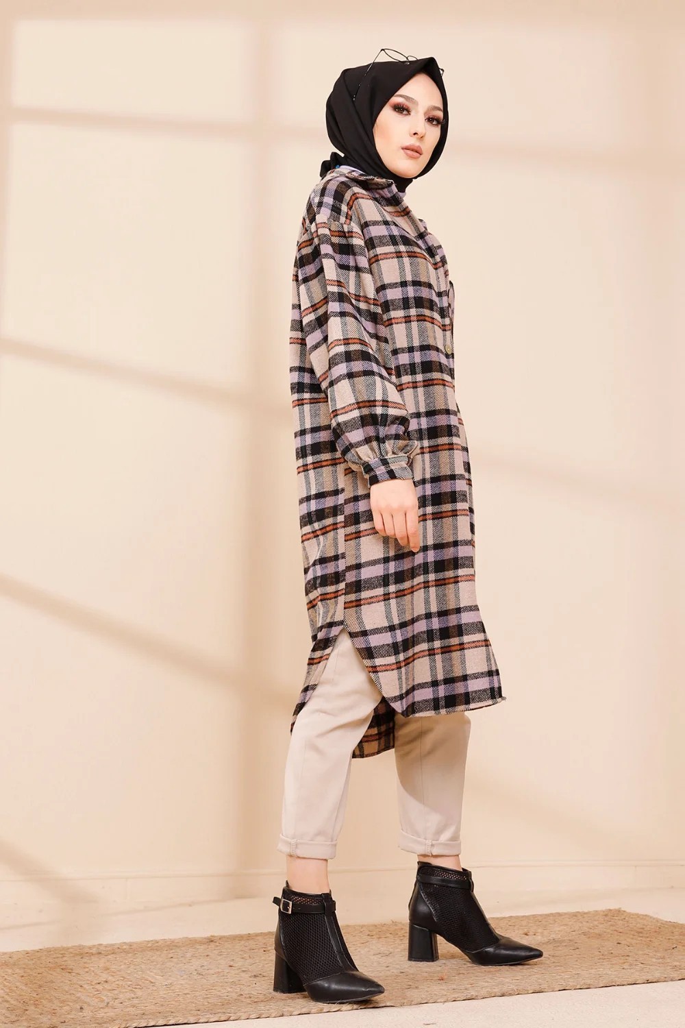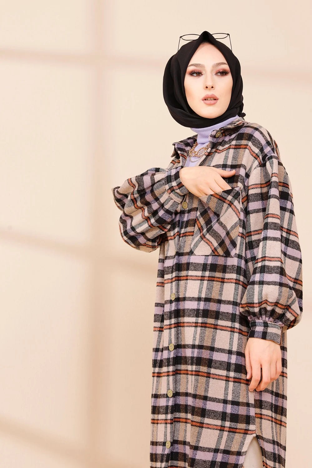 Tunique longue boutonnée à carreaux pour femme (Vetement Hijab Automne-Hiver) - Couleur gris - REF. 38294 (25.00 €)