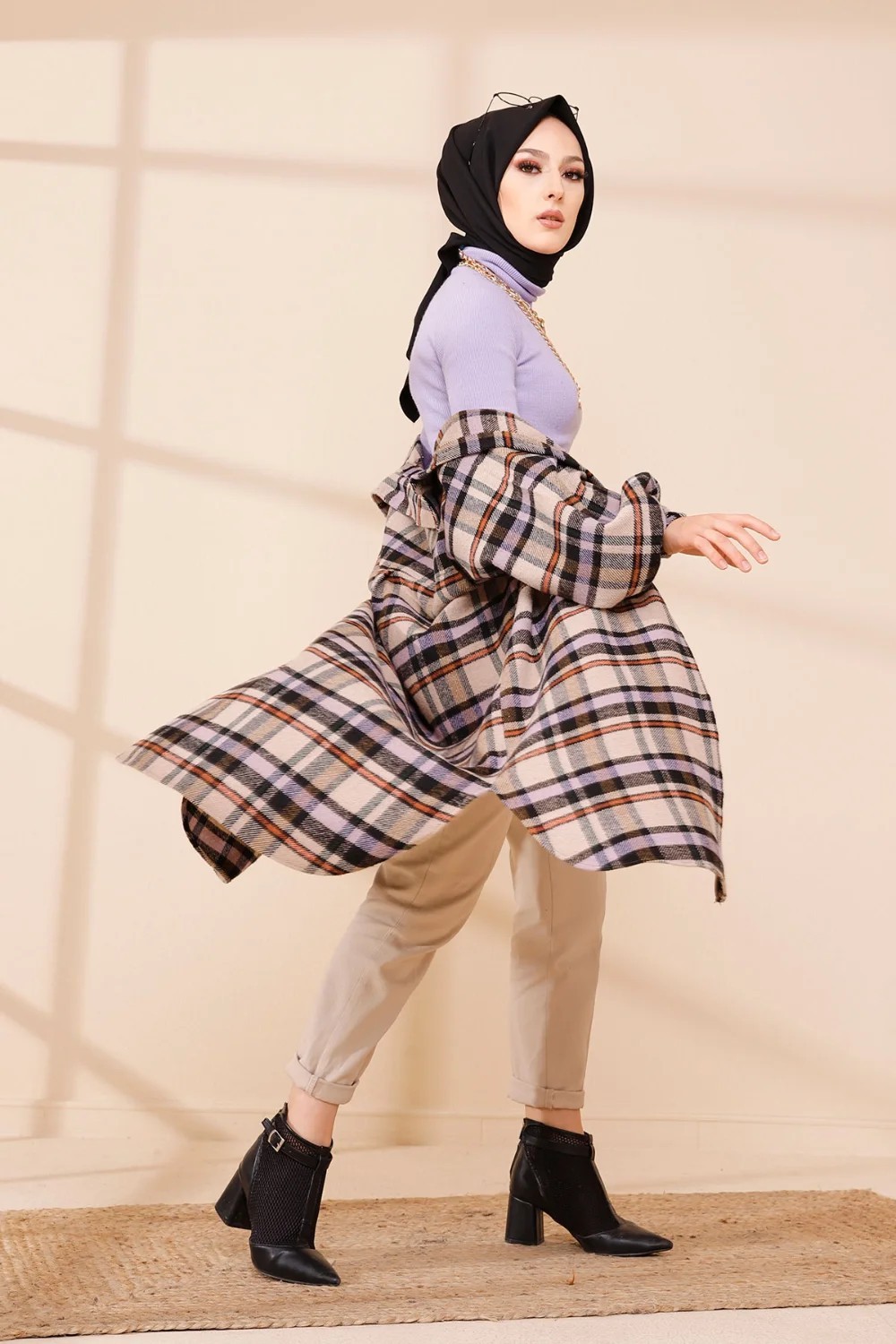 Veste Manteau femme avec ceinture intégrée (Tunique Automne Hiver - Vêtement Hijab Turque en ligne) - Couleur prune - REF. 35329 (19.90 €)