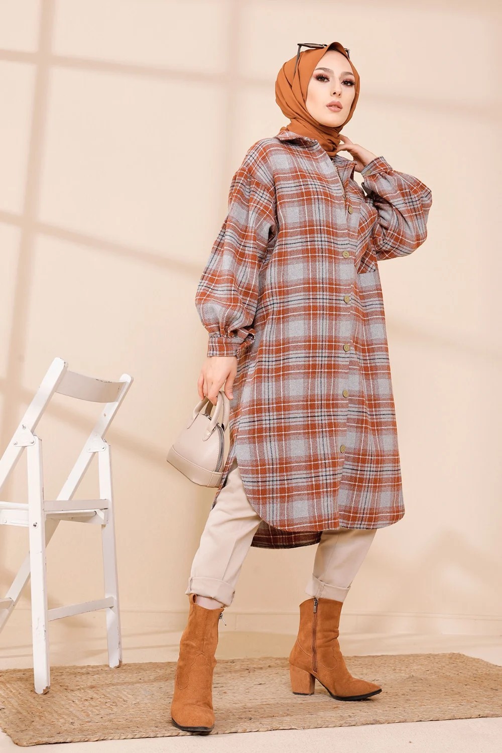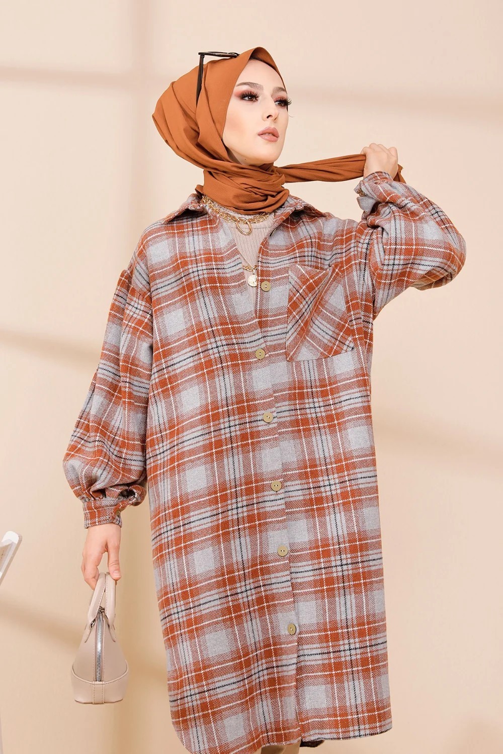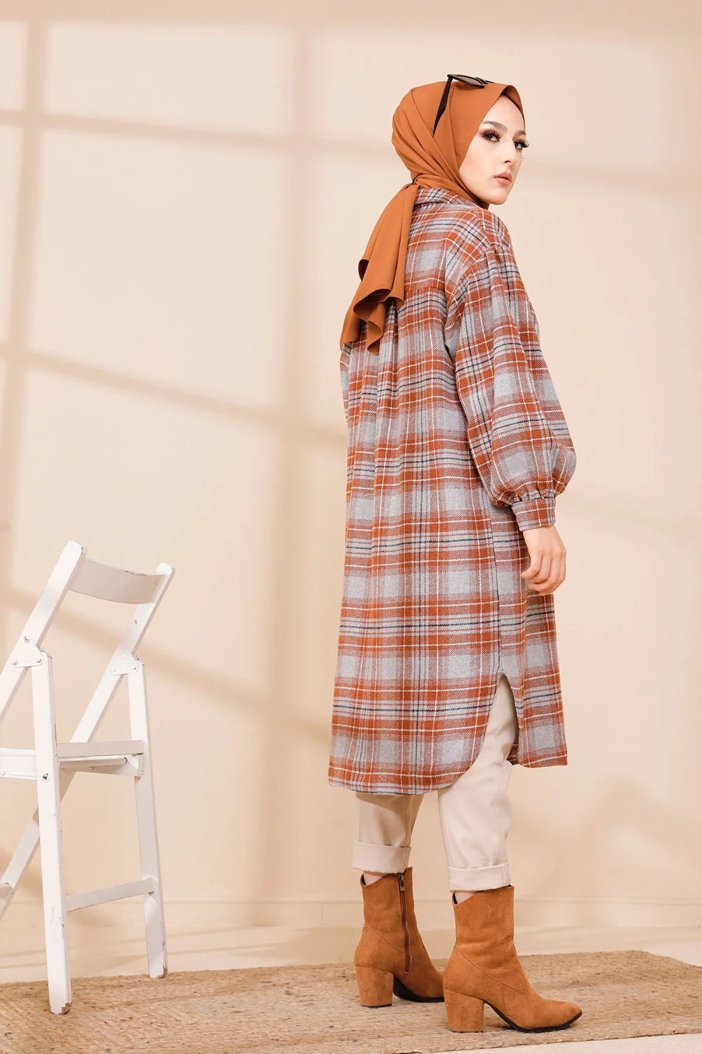 Surchemise longue et ample a carreaux (Modest Fashion) - Couleur brique