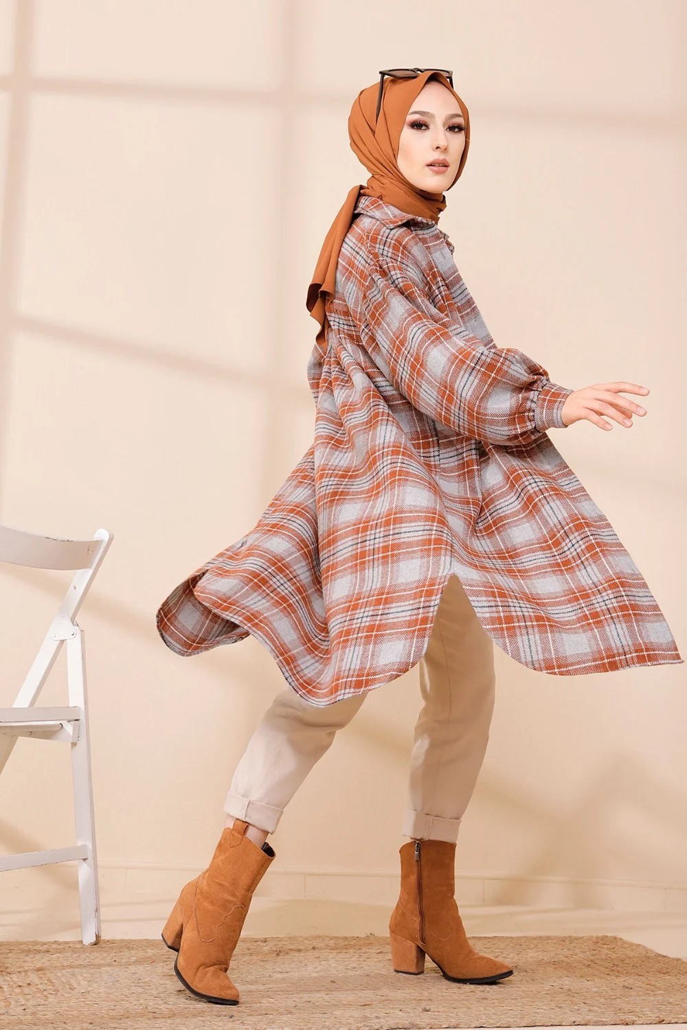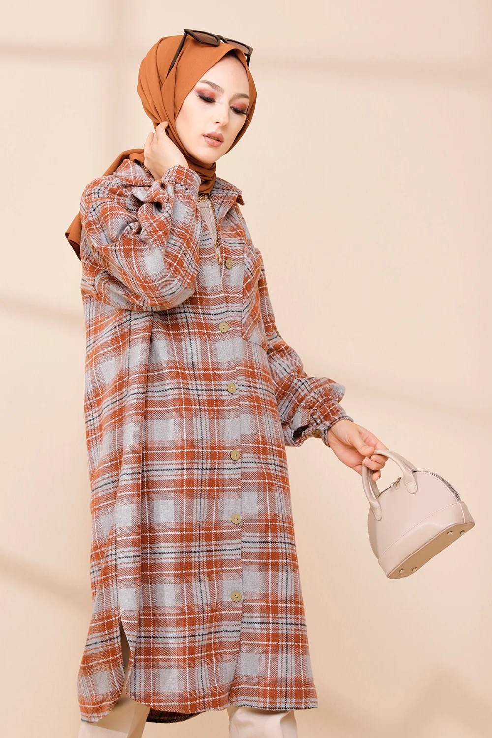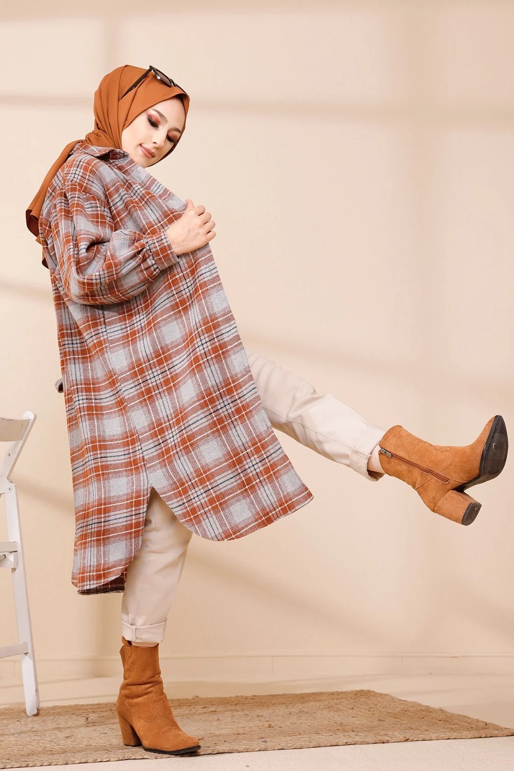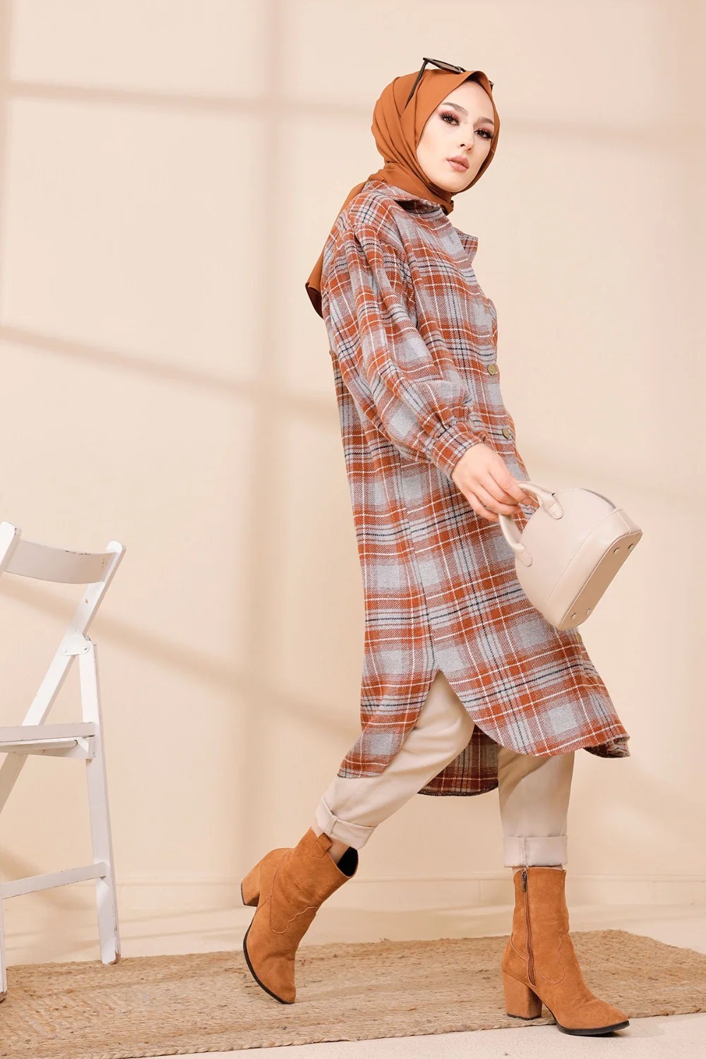 Surchemise longue et ample a carreaux (Modest Fashion) - Couleur brique