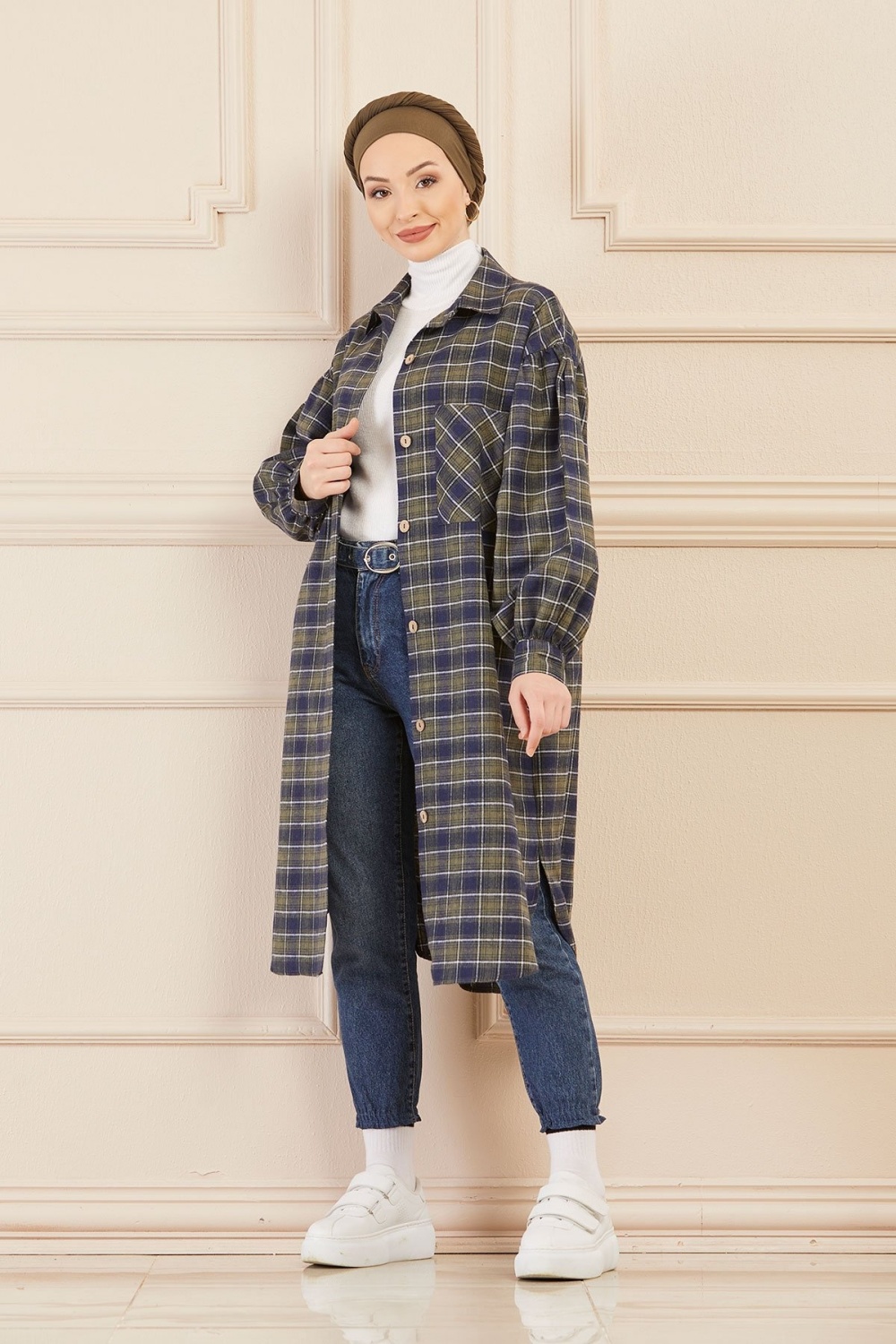 Chemise longue à carreaux pour femme (Vêtement musulmane Paris) - Couleur anthracite et écru - REF. 38332 (24.90 €)