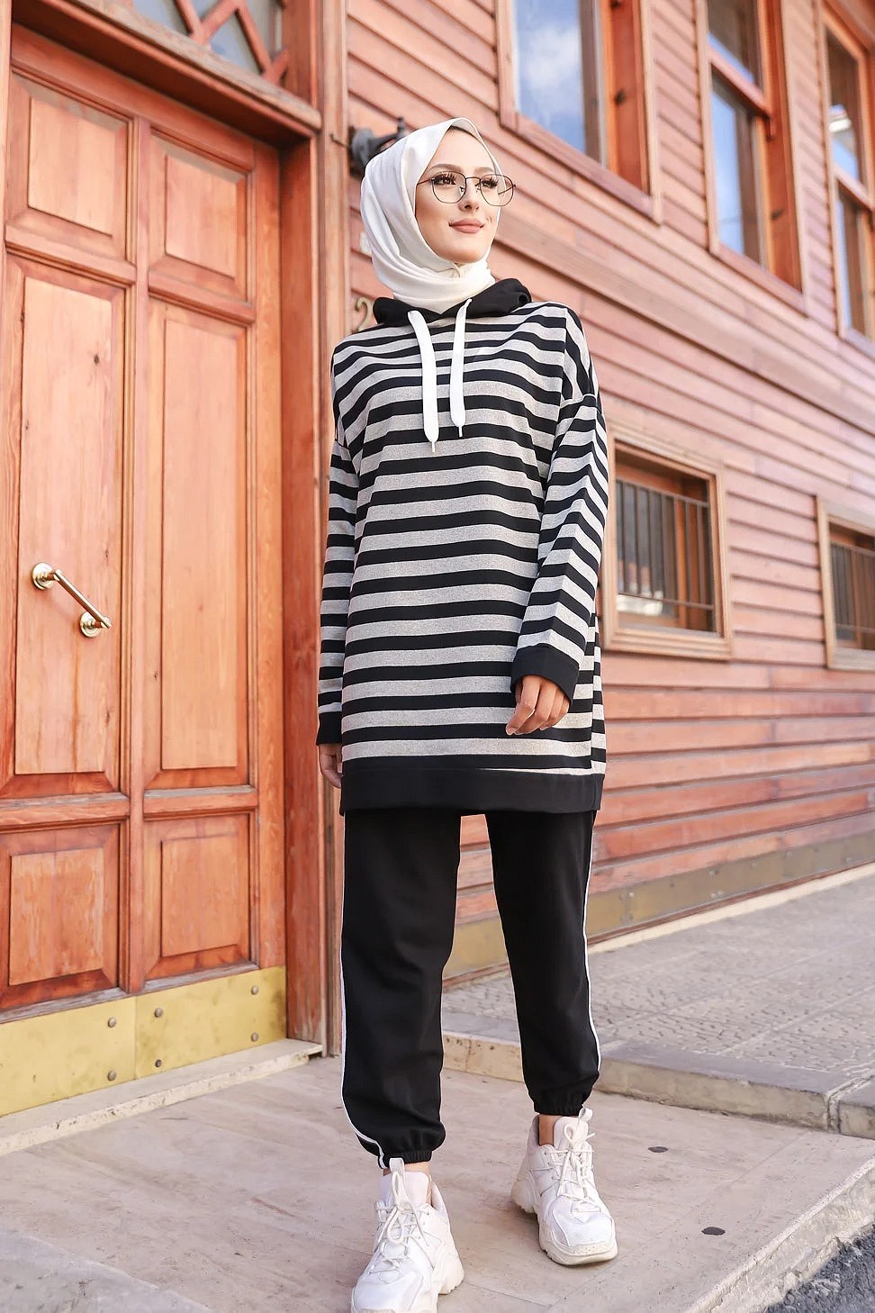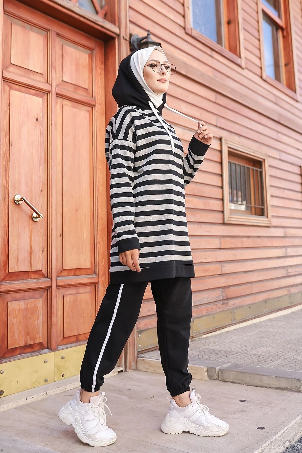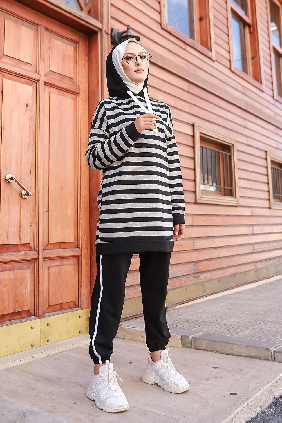 Survêtement Hijab jogging musulman 2 pièces - Tunique à rayure pour femme voilée - Couleur gris et noir Vetement & Accessoire