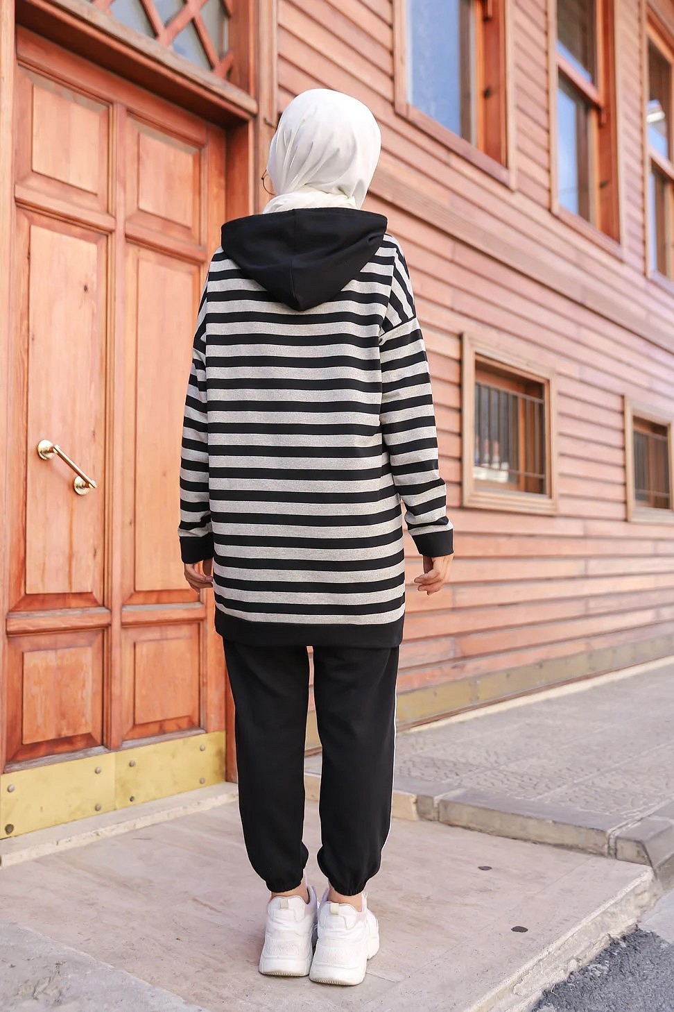 Survetement Hijab jogging musulman 2 pieces - Tunique a rayure pour femme voilee - Couleur gris et noir