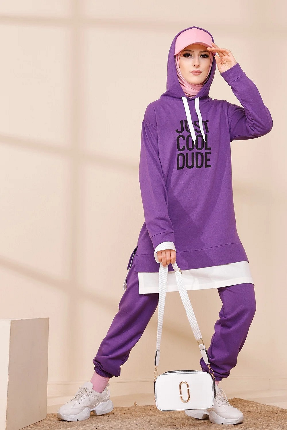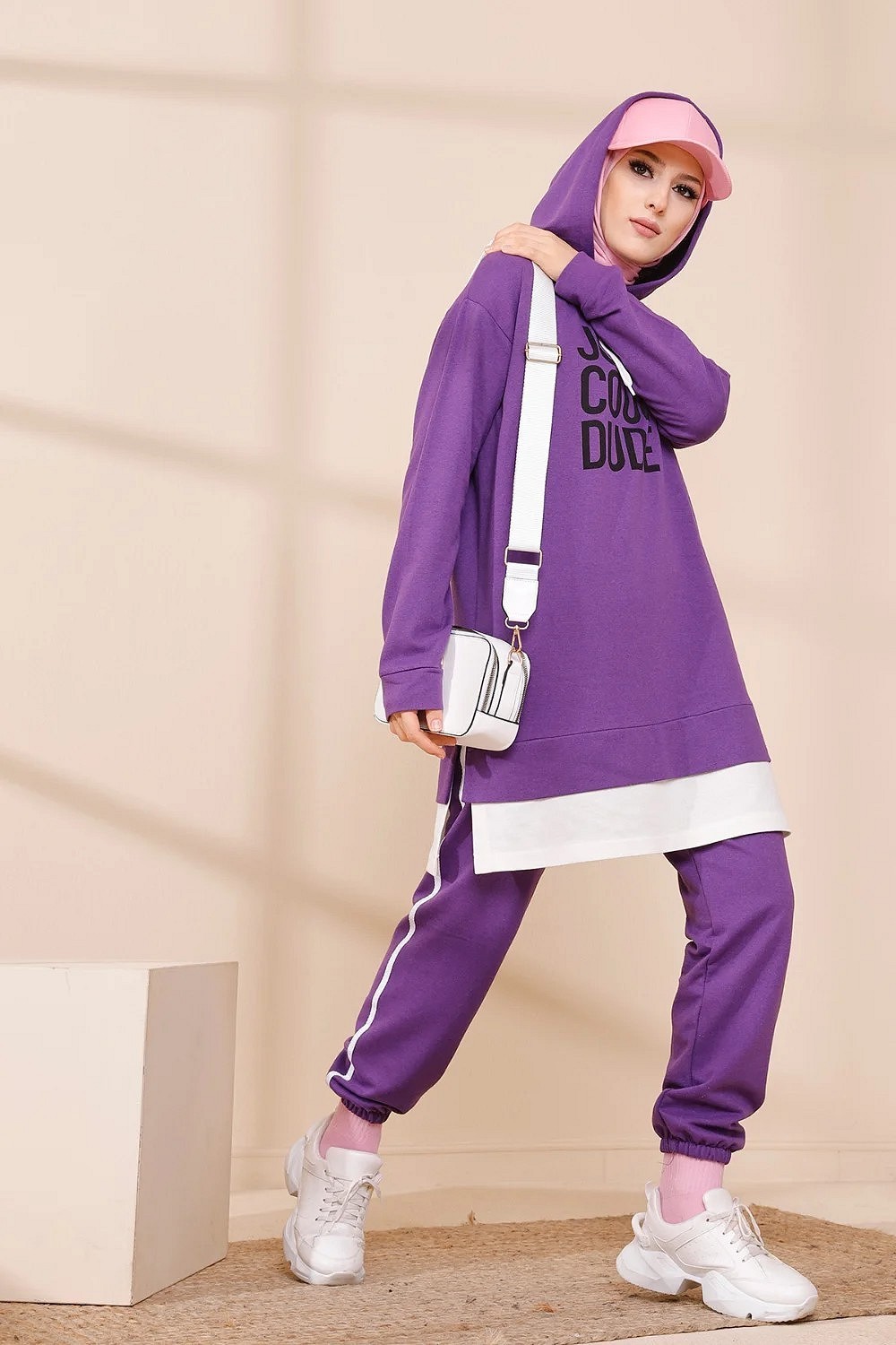 Survêtement décontracté avec extension blanche - Sweat à capuche imprimé et pantalon (Boutique de vêtement pour femme voilée) - Couleur violet Vetement & Accessoire